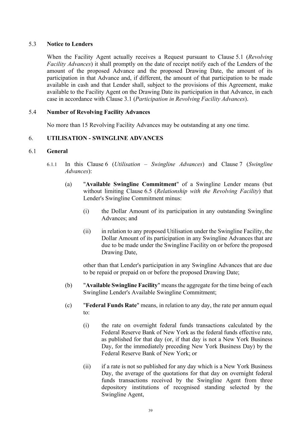 39 5.3 Notice to Lenders When the Facility Agent actually receives a Request pursuant to Clause 5.1 (Revolving Facility Advances) it shall promptly on the date of receipt notify each of the Lenders of the amount of the proposed Advance and the proposed Drawing Date, the amount of its participation in that Advance and, if different, the amount of that participation to be made available in cash and that Lender shall, subject to the provisions of this Agreement, make available to the Facility Agent on the Drawing Date its participation in that Advance, in each case in accordance with Clause 3.1 (Participation in Revolving Facility Advances). 5.4 Number of Revolving Facility Advances No more than 15 Revolving Facility Advances may be outstanding at any one time. 6. UTILISATION - SWINGLINE ADVANCES 6.1 General 6.1.1 In this Clause 6 (Utilisation – Swingline Advances) and Clause 7 (Swingline Advances): (a) "Available Swingline Commitment" of a Swingline Lender means (but without limiting Clause 6.5 (Relationship with the Revolving Facility) that Lender's Swingline Commitment minus: (i) the Dollar Amount of its participation in any outstanding Swingline Advances; and (ii) in relation to any proposed Utilisation under the Swingline Facility, the Dollar Amount of its participation in any Swingline Advances that are due to be made under the Swingline Facility on or before the proposed Drawing Date, other than that Lender's participation in any Swingline Advances that are due to be repaid or prepaid on or before the proposed Drawing Date; (b) "Available Swingline Facility" means the aggregate for the time being of each Swingline Lender's Available Swingline Commitment; (c) "Federal Funds Rate" means, in relation to any day, the rate per annum equal to: (i) the rate on overnight federal funds transactions calculated by the Federal Reserve Bank of New York as the federal funds effective rate, as published for that day (or, if that day is not a New York Business Day, for the immediately preceding New York Business Day) by the Federal Reserve Bank of New York; or (ii) if a rate is not so published for any day which is a New York Business Day, the average of the quotations for that day on overnight federal funds transactions received by the Swingline Agent from three depository institutions of recognised standing selected by the Swingline Agent,