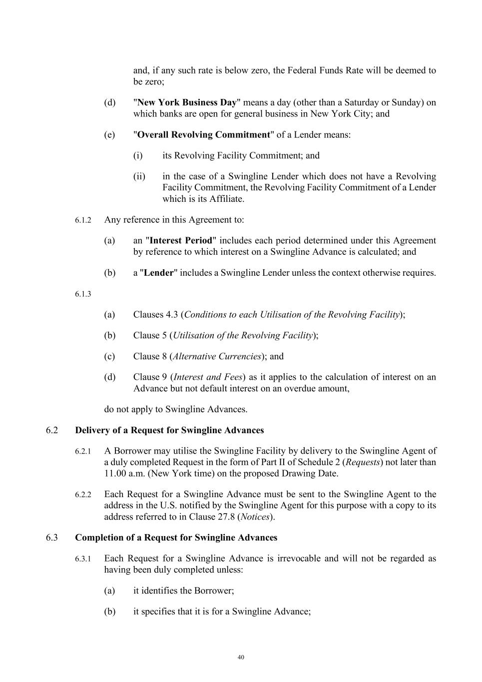 40 and, if any such rate is below zero, the Federal Funds Rate will be deemed to be zero; (d) "New York Business Day" means a day (other than a Saturday or Sunday) on which banks are open for general business in New York City; and (e) "Overall Revolving Commitment" of a Lender means: (i) its Revolving Facility Commitment; and (ii) in the case of a Swingline Lender which does not have a Revolving Facility Commitment, the Revolving Facility Commitment of a Lender which is its Affiliate. 6.1.2 Any reference in this Agreement to: (a) an "Interest Period" includes each period determined under this Agreement by reference to which interest on a Swingline Advance is calculated; and (b) a "Lender" includes a Swingline Lender unless the context otherwise requires. 6.1.3 (a) Clauses 4.3 (Conditions to each Utilisation of the Revolving Facility); (b) Clause 5 (Utilisation of the Revolving Facility); (c) Clause 8 (Alternative Currencies); and (d) Clause 9 (Interest and Fees) as it applies to the calculation of interest on an Advance but not default interest on an overdue amount, do not apply to Swingline Advances. 6.2 Delivery of a Request for Swingline Advances 6.2.1 A Borrower may utilise the Swingline Facility by delivery to the Swingline Agent of a duly completed Request in the form of Part II of Schedule 2 (Requests) not later than 11.00 a.m. (New York time) on the proposed Drawing Date. 6.2.2 Each Request for a Swingline Advance must be sent to the Swingline Agent to the address in the U.S. notified by the Swingline Agent for this purpose with a copy to its address referred to in Clause 27.8 (Notices). 6.3 Completion of a Request for Swingline Advances 6.3.1 Each Request for a Swingline Advance is irrevocable and will not be regarded as having been duly completed unless: (a) it identifies the Borrower; (b) it specifies that it is for a Swingline Advance;