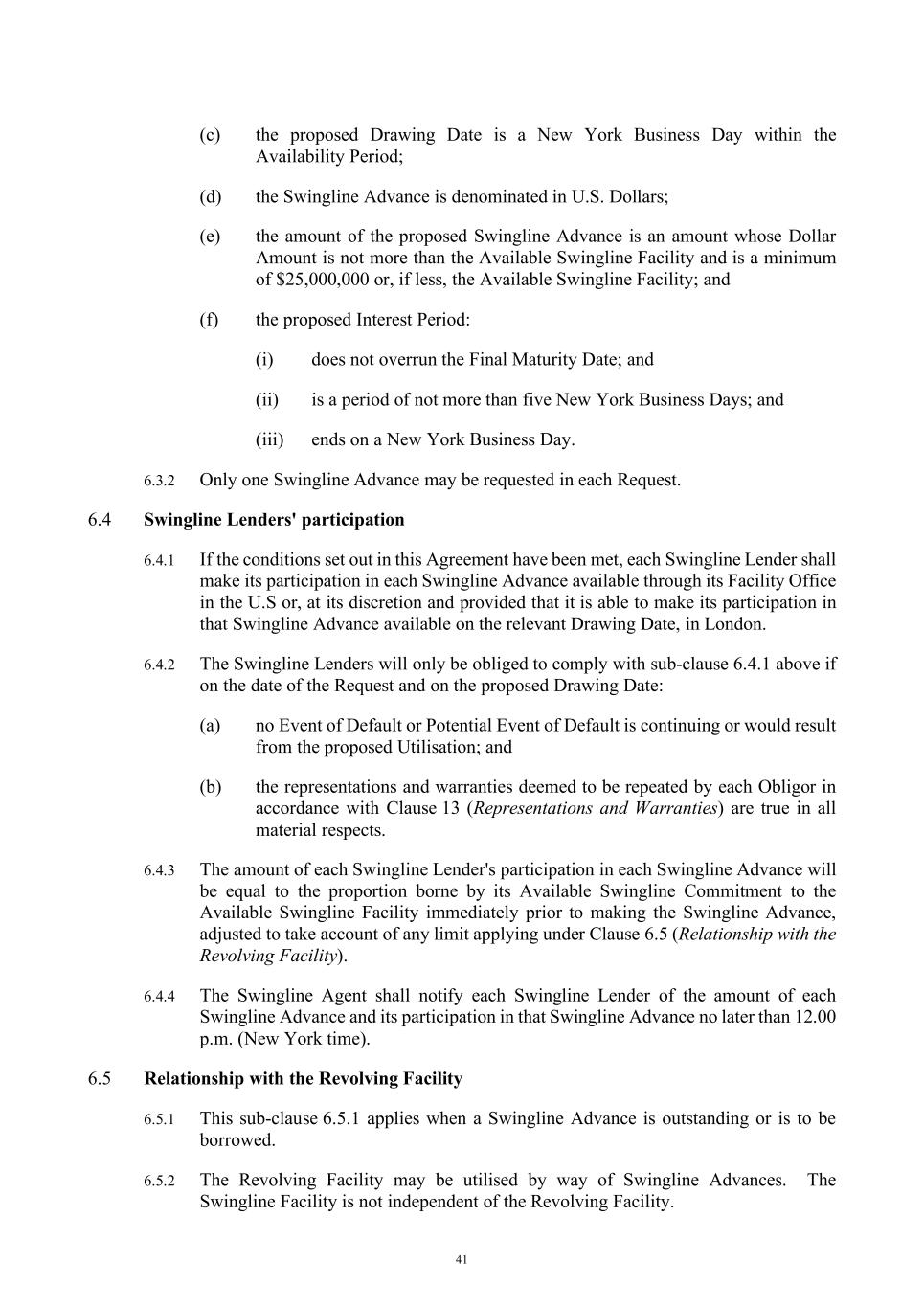 41 (c) the proposed Drawing Date is a New York Business Day within the Availability Period; (d) the Swingline Advance is denominated in U.S. Dollars; (e) the amount of the proposed Swingline Advance is an amount whose Dollar Amount is not more than the Available Swingline Facility and is a minimum of $25,000,000 or, if less, the Available Swingline Facility; and (f) the proposed Interest Period: (i) does not overrun the Final Maturity Date; and (ii) is a period of not more than five New York Business Days; and (iii) ends on a New York Business Day. 6.3.2 Only one Swingline Advance may be requested in each Request. 6.4 Swingline Lenders' participation 6.4.1 If the conditions set out in this Agreement have been met, each Swingline Lender shall make its participation in each Swingline Advance available through its Facility Office in the U.S or, at its discretion and provided that it is able to make its participation in that Swingline Advance available on the relevant Drawing Date, in London. 6.4.2 The Swingline Lenders will only be obliged to comply with sub-clause 6.4.1 above if on the date of the Request and on the proposed Drawing Date: (a) no Event of Default or Potential Event of Default is continuing or would result from the proposed Utilisation; and (b) the representations and warranties deemed to be repeated by each Obligor in accordance with Clause 13 (Representations and Warranties) are true in all material respects. 6.4.3 The amount of each Swingline Lender's participation in each Swingline Advance will be equal to the proportion borne by its Available Swingline Commitment to the Available Swingline Facility immediately prior to making the Swingline Advance, adjusted to take account of any limit applying under Clause 6.5 (Relationship with the Revolving Facility). 6.4.4 The Swingline Agent shall notify each Swingline Lender of the amount of each Swingline Advance and its participation in that Swingline Advance no later than 12.00 p.m. (New York time). 6.5 Relationship with the Revolving Facility 6.5.1 This sub-clause 6.5.1 applies when a Swingline Advance is outstanding or is to be borrowed. 6.5.2 The Revolving Facility may be utilised by way of Swingline Advances. The Swingline Facility is not independent of the Revolving Facility.