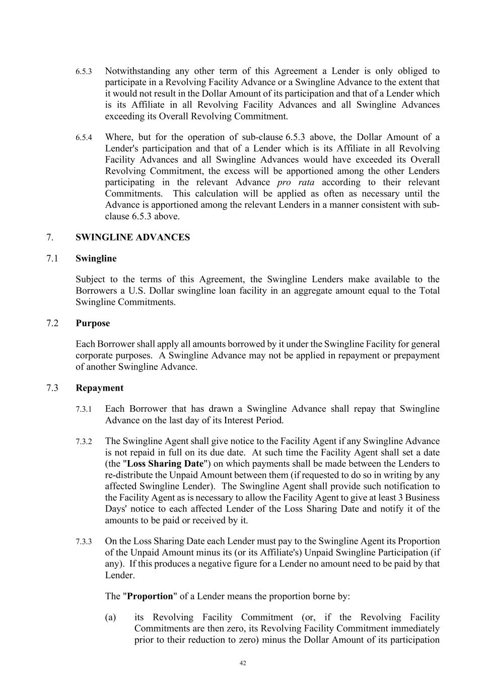 42 6.5.3 Notwithstanding any other term of this Agreement a Lender is only obliged to participate in a Revolving Facility Advance or a Swingline Advance to the extent that it would not result in the Dollar Amount of its participation and that of a Lender which is its Affiliate in all Revolving Facility Advances and all Swingline Advances exceeding its Overall Revolving Commitment. 6.5.4 Where, but for the operation of sub-clause 6.5.3 above, the Dollar Amount of a Lender's participation and that of a Lender which is its Affiliate in all Revolving Facility Advances and all Swingline Advances would have exceeded its Overall Revolving Commitment, the excess will be apportioned among the other Lenders participating in the relevant Advance pro rata according to their relevant Commitments. This calculation will be applied as often as necessary until the Advance is apportioned among the relevant Lenders in a manner consistent with sub- clause 6.5.3 above. 7. SWINGLINE ADVANCES 7.1 Swingline Subject to the terms of this Agreement, the Swingline Lenders make available to the Borrowers a U.S. Dollar swingline loan facility in an aggregate amount equal to the Total Swingline Commitments. 7.2 Purpose Each Borrower shall apply all amounts borrowed by it under the Swingline Facility for general corporate purposes. A Swingline Advance may not be applied in repayment or prepayment of another Swingline Advance. 7.3 Repayment 7.3.1 Each Borrower that has drawn a Swingline Advance shall repay that Swingline Advance on the last day of its Interest Period. 7.3.2 The Swingline Agent shall give notice to the Facility Agent if any Swingline Advance is not repaid in full on its due date. At such time the Facility Agent shall set a date (the "Loss Sharing Date") on which payments shall be made between the Lenders to re-distribute the Unpaid Amount between them (if requested to do so in writing by any affected Swingline Lender). The Swingline Agent shall provide such notification to the Facility Agent as is necessary to allow the Facility Agent to give at least 3 Business Days' notice to each affected Lender of the Loss Sharing Date and notify it of the amounts to be paid or received by it. 7.3.3 On the Loss Sharing Date each Lender must pay to the Swingline Agent its Proportion of the Unpaid Amount minus its (or its Affiliate's) Unpaid Swingline Participation (if any). If this produces a negative figure for a Lender no amount need to be paid by that Lender. The "Proportion" of a Lender means the proportion borne by: (a) its Revolving Facility Commitment (or, if the Revolving Facility Commitments are then zero, its Revolving Facility Commitment immediately prior to their reduction to zero) minus the Dollar Amount of its participation