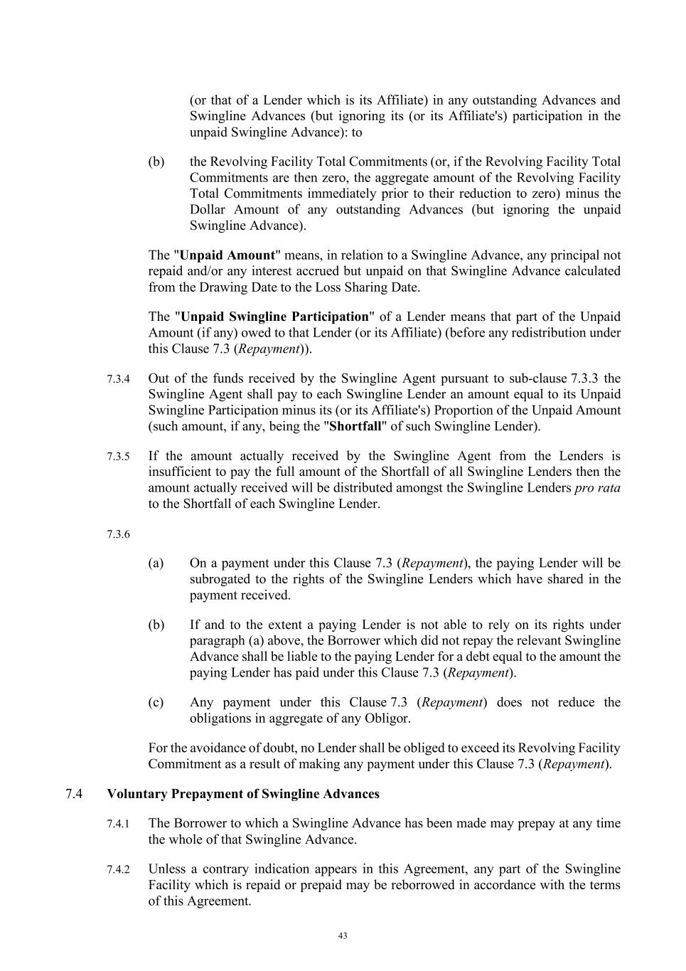 43 (or that of a Lender which is its Affiliate) in any outstanding Advances and Swingline Advances (but ignoring its (or its Affiliate's) participation in the unpaid Swingline Advance): to (b) the Revolving Facility Total Commitments (or, if the Revolving Facility Total Commitments are then zero, the aggregate amount of the Revolving Facility Total Commitments immediately prior to their reduction to zero) minus the Dollar Amount of any outstanding Advances (but ignoring the unpaid Swingline Advance). The "Unpaid Amount" means, in relation to a Swingline Advance, any principal not repaid and/or any interest accrued but unpaid on that Swingline Advance calculated from the Drawing Date to the Loss Sharing Date. The "Unpaid Swingline Participation" of a Lender means that part of the Unpaid Amount (if any) owed to that Lender (or its Affiliate) (before any redistribution under this Clause 7.3 (Repayment)). 7.3.4 Out of the funds received by the Swingline Agent pursuant to sub-clause 7.3.3 the Swingline Agent shall pay to each Swingline Lender an amount equal to its Unpaid Swingline Participation minus its (or its Affiliate's) Proportion of the Unpaid Amount (such amount, if any, being the "Shortfall" of such Swingline Lender). 7.3.5 If the amount actually received by the Swingline Agent from the Lenders is insufficient to pay the full amount of the Shortfall of all Swingline Lenders then the amount actually received will be distributed amongst the Swingline Lenders pro rata to the Shortfall of each Swingline Lender. 7.3.6 (a) On a payment under this Clause 7.3 (Repayment), the paying Lender will be subrogated to the rights of the Swingline Lenders which have shared in the payment received. (b) If and to the extent a paying Lender is not able to rely on its rights under paragraph (a) above, the Borrower which did not repay the relevant Swingline Advance shall be liable to the paying Lender for a debt equal to the amount the paying Lender has paid under this Clause 7.3 (Repayment). (c) Any payment under this Clause 7.3 (Repayment) does not reduce the obligations in aggregate of any Obligor. For the avoidance of doubt, no Lender shall be obliged to exceed its Revolving Facility Commitment as a result of making any payment under this Clause 7.3 (Repayment). 7.4 Voluntary Prepayment of Swingline Advances 7.4.1 The Borrower to which a Swingline Advance has been made may prepay at any time the whole of that Swingline Advance. 7.4.2 Unless a contrary indication appears in this Agreement, any part of the Swingline Facility which is repaid or prepaid may be reborrowed in accordance with the terms of this Agreement.