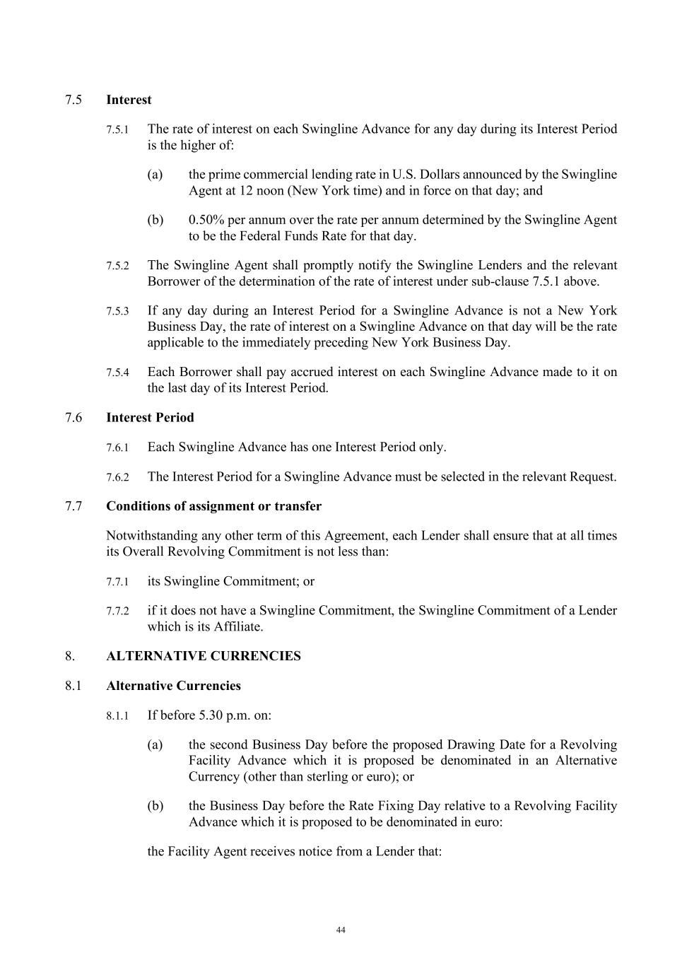 44 7.5 Interest 7.5.1 The rate of interest on each Swingline Advance for any day during its Interest Period is the higher of: (a) the prime commercial lending rate in U.S. Dollars announced by the Swingline Agent at 12 noon (New York time) and in force on that day; and (b) 0.50% per annum over the rate per annum determined by the Swingline Agent to be the Federal Funds Rate for that day. 7.5.2 The Swingline Agent shall promptly notify the Swingline Lenders and the relevant Borrower of the determination of the rate of interest under sub-clause 7.5.1 above. 7.5.3 If any day during an Interest Period for a Swingline Advance is not a New York Business Day, the rate of interest on a Swingline Advance on that day will be the rate applicable to the immediately preceding New York Business Day. 7.5.4 Each Borrower shall pay accrued interest on each Swingline Advance made to it on the last day of its Interest Period. 7.6 Interest Period 7.6.1 Each Swingline Advance has one Interest Period only. 7.6.2 The Interest Period for a Swingline Advance must be selected in the relevant Request. 7.7 Conditions of assignment or transfer Notwithstanding any other term of this Agreement, each Lender shall ensure that at all times its Overall Revolving Commitment is not less than: 7.7.1 its Swingline Commitment; or 7.7.2 if it does not have a Swingline Commitment, the Swingline Commitment of a Lender which is its Affiliate. 8. ALTERNATIVE CURRENCIES 8.1 Alternative Currencies 8.1.1 If before 5.30 p.m. on: (a) the second Business Day before the proposed Drawing Date for a Revolving Facility Advance which it is proposed be denominated in an Alternative Currency (other than sterling or euro); or (b) the Business Day before the Rate Fixing Day relative to a Revolving Facility Advance which it is proposed to be denominated in euro: the Facility Agent receives notice from a Lender that: