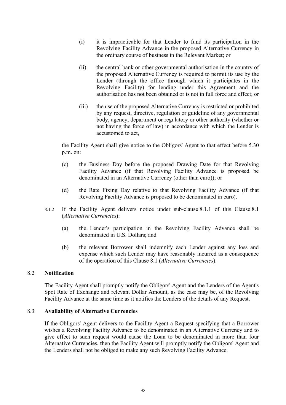 45 (i) it is impracticable for that Lender to fund its participation in the Revolving Facility Advance in the proposed Alternative Currency in the ordinary course of business in the Relevant Market; or (ii) the central bank or other governmental authorisation in the country of the proposed Alternative Currency is required to permit its use by the Lender (through the office through which it participates in the Revolving Facility) for lending under this Agreement and the authorisation has not been obtained or is not in full force and effect; or (iii) the use of the proposed Alternative Currency is restricted or prohibited by any request, directive, regulation or guideline of any governmental body, agency, department or regulatory or other authority (whether or not having the force of law) in accordance with which the Lender is accustomed to act, the Facility Agent shall give notice to the Obligors' Agent to that effect before 5.30 p.m. on: (c) the Business Day before the proposed Drawing Date for that Revolving Facility Advance (if that Revolving Facility Advance is proposed be denominated in an Alternative Currency (other than euro)); or (d) the Rate Fixing Day relative to that Revolving Facility Advance (if that Revolving Facility Advance is proposed to be denominated in euro). 8.1.2 If the Facility Agent delivers notice under sub-clause 8.1.1 of this Clause 8.1 (Alternative Currencies): (a) the Lender's participation in the Revolving Facility Advance shall be denominated in U.S. Dollars; and (b) the relevant Borrower shall indemnify each Lender against any loss and expense which such Lender may have reasonably incurred as a consequence of the operation of this Clause 8.1 (Alternative Currencies). 8.2 Notification The Facility Agent shall promptly notify the Obligors' Agent and the Lenders of the Agent's Spot Rate of Exchange and relevant Dollar Amount, as the case may be, of the Revolving Facility Advance at the same time as it notifies the Lenders of the details of any Request. 8.3 Availability of Alternative Currencies If the Obligors' Agent delivers to the Facility Agent a Request specifying that a Borrower wishes a Revolving Facility Advance to be denominated in an Alternative Currency and to give effect to such request would cause the Loan to be denominated in more than four Alternative Currencies, then the Facility Agent will promptly notify the Obligors' Agent and the Lenders shall not be obliged to make any such Revolving Facility Advance.