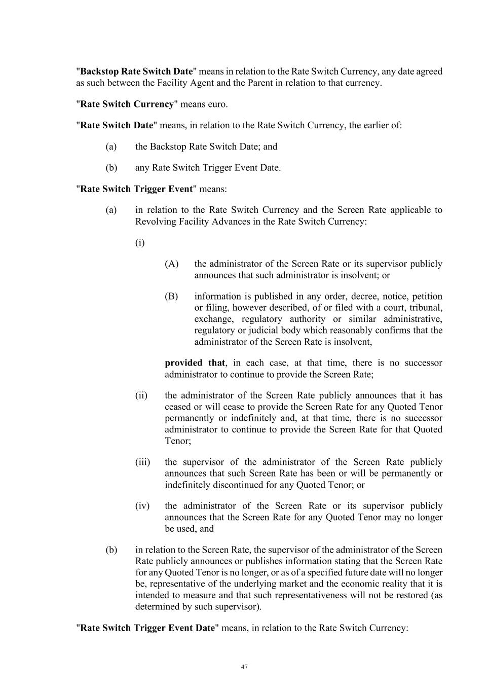 47 "Backstop Rate Switch Date" means in relation to the Rate Switch Currency, any date agreed as such between the Facility Agent and the Parent in relation to that currency. "Rate Switch Currency" means euro. "Rate Switch Date" means, in relation to the Rate Switch Currency, the earlier of: (a) the Backstop Rate Switch Date; and (b) any Rate Switch Trigger Event Date. "Rate Switch Trigger Event" means: (a) in relation to the Rate Switch Currency and the Screen Rate applicable to Revolving Facility Advances in the Rate Switch Currency: (i) (A) the administrator of the Screen Rate or its supervisor publicly announces that such administrator is insolvent; or (B) information is published in any order, decree, notice, petition or filing, however described, of or filed with a court, tribunal, exchange, regulatory authority or similar administrative, regulatory or judicial body which reasonably confirms that the administrator of the Screen Rate is insolvent, provided that, in each case, at that time, there is no successor administrator to continue to provide the Screen Rate; (ii) the administrator of the Screen Rate publicly announces that it has ceased or will cease to provide the Screen Rate for any Quoted Tenor permanently or indefinitely and, at that time, there is no successor administrator to continue to provide the Screen Rate for that Quoted Tenor; (iii) the supervisor of the administrator of the Screen Rate publicly announces that such Screen Rate has been or will be permanently or indefinitely discontinued for any Quoted Tenor; or (iv) the administrator of the Screen Rate or its supervisor publicly announces that the Screen Rate for any Quoted Tenor may no longer be used, and (b) in relation to the Screen Rate, the supervisor of the administrator of the Screen Rate publicly announces or publishes information stating that the Screen Rate for any Quoted Tenor is no longer, or as of a specified future date will no longer be, representative of the underlying market and the economic reality that it is intended to measure and that such representativeness will not be restored (as determined by such supervisor). "Rate Switch Trigger Event Date" means, in relation to the Rate Switch Currency: