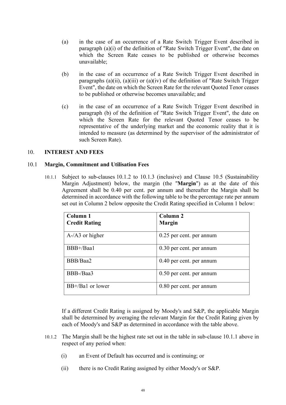 48 (a) in the case of an occurrence of a Rate Switch Trigger Event described in paragraph (a)(i) of the definition of "Rate Switch Trigger Event", the date on which the Screen Rate ceases to be published or otherwise becomes unavailable; (b) in the case of an occurrence of a Rate Switch Trigger Event described in paragraphs (a)(ii), (a)(iii) or (a)(iv) of the definition of "Rate Switch Trigger Event", the date on which the Screen Rate for the relevant Quoted Tenor ceases to be published or otherwise becomes unavailable; and (c) in the case of an occurrence of a Rate Switch Trigger Event described in paragraph (b) of the definition of "Rate Switch Trigger Event", the date on which the Screen Rate for the relevant Quoted Tenor ceases to be representative of the underlying market and the economic reality that it is intended to measure (as determined by the supervisor of the administrator of such Screen Rate). 10. INTEREST AND FEES 10.1 Margin, Commitment and Utilisation Fees 10.1.1 Subject to sub-clauses 10.1.2 to 10.1.3 (inclusive) and Clause 10.5 (Sustainability Margin Adjustment) below, the margin (the "Margin") as at the date of this Agreement shall be 0.40 per cent. per annum and thereafter the Margin shall be determined in accordance with the following table to be the percentage rate per annum set out in Column 2 below opposite the Credit Rating specified in Column 1 below: Column 1 Credit Rating Column 2 Margin A-/A3 or higher 0.25 per cent. per annum BBB+/Baa1 0.30 per cent. per annum BBB/Baa2 0.40 per cent. per annum BBB-/Baa3 0.50 per cent. per annum BB+/Ba1 or lower 0.80 per cent. per annum If a different Credit Rating is assigned by Moody's and S&P, the applicable Margin shall be determined by averaging the relevant Margin for the Credit Rating given by each of Moody's and S&P as determined in accordance with the table above. 10.1.2 The Margin shall be the highest rate set out in the table in sub-clause 10.1.1 above in respect of any period when: (i) an Event of Default has occurred and is continuing; or (ii) there is no Credit Rating assigned by either Moody's or S&P.