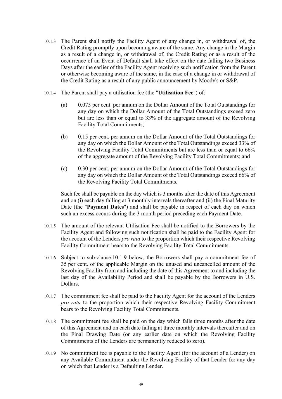 49 10.1.3 The Parent shall notify the Facility Agent of any change in, or withdrawal of, the Credit Rating promptly upon becoming aware of the same. Any change in the Margin as a result of a change in, or withdrawal of, the Credit Rating or as a result of the occurrence of an Event of Default shall take effect on the date falling two Business Days after the earlier of the Facility Agent receiving such notification from the Parent or otherwise becoming aware of the same, in the case of a change in or withdrawal of the Credit Rating as a result of any public announcement by Moody's or S&P. 10.1.4 The Parent shall pay a utilisation fee (the "Utilisation Fee") of: (a) 0.075 per cent. per annum on the Dollar Amount of the Total Outstandings for any day on which the Dollar Amount of the Total Outstandings exceed zero but are less than or equal to 33% of the aggregate amount of the Revolving Facility Total Commitments; (b) 0.15 per cent. per annum on the Dollar Amount of the Total Outstandings for any day on which the Dollar Amount of the Total Outstandings exceed 33% of the Revolving Facility Total Commitments but are less than or equal to 66% of the aggregate amount of the Revolving Facility Total Commitments; and (c) 0.30 per cent. per annum on the Dollar Amount of the Total Outstandings for any day on which the Dollar Amount of the Total Outstandings exceed 66% of the Revolving Facility Total Commitments. Such fee shall be payable on the day which is 3 months after the date of this Agreement and on (i) each day falling at 3 monthly intervals thereafter and (ii) the Final Maturity Date (the "Payment Dates") and shall be payable in respect of each day on which such an excess occurs during the 3 month period preceding each Payment Date. 10.1.5 The amount of the relevant Utilisation Fee shall be notified to the Borrowers by the Facility Agent and following such notification shall be paid to the Facility Agent for the account of the Lenders pro rata to the proportion which their respective Revolving Facility Commitment bears to the Revolving Facility Total Commitments. 10.1.6 Subject to sub-clause 10.1.9 below, the Borrowers shall pay a commitment fee of 35 per cent. of the applicable Margin on the unused and uncancelled amount of the Revolving Facility from and including the date of this Agreement to and including the last day of the Availability Period and shall be payable by the Borrowers in U.S. Dollars. 10.1.7 The commitment fee shall be paid to the Facility Agent for the account of the Lenders pro rata to the proportion which their respective Revolving Facility Commitment bears to the Revolving Facility Total Commitments. 10.1.8 The commitment fee shall be paid on the day which falls three months after the date of this Agreement and on each date falling at three monthly intervals thereafter and on the Final Drawing Date (or any earlier date on which the Revolving Facility Commitments of the Lenders are permanently reduced to zero). 10.1.9 No commitment fee is payable to the Facility Agent (for the account of a Lender) on any Available Commitment under the Revolving Facility of that Lender for any day on which that Lender is a Defaulting Lender.