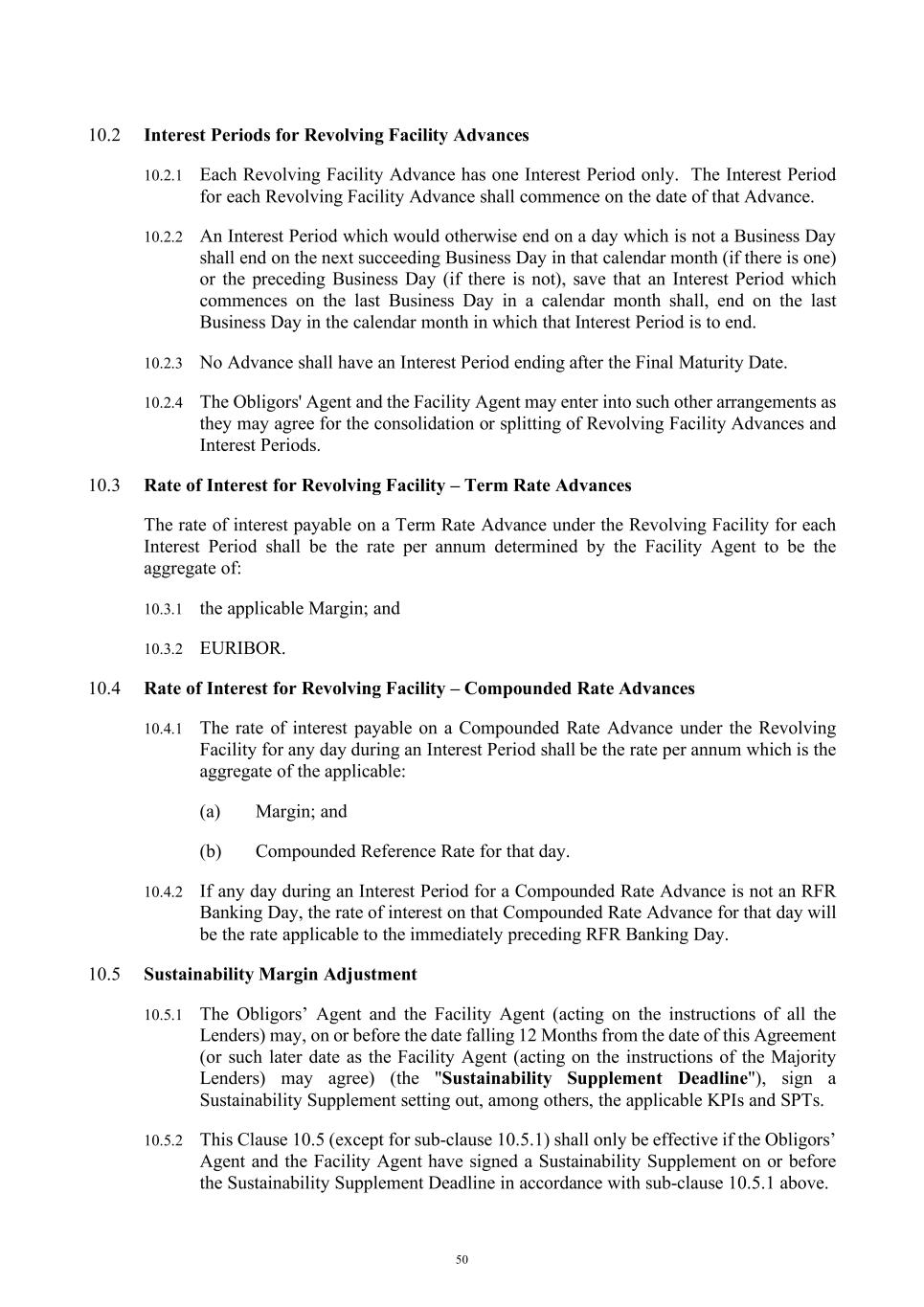 50 10.2 Interest Periods for Revolving Facility Advances 10.2.1 Each Revolving Facility Advance has one Interest Period only. The Interest Period for each Revolving Facility Advance shall commence on the date of that Advance. 10.2.2 An Interest Period which would otherwise end on a day which is not a Business Day shall end on the next succeeding Business Day in that calendar month (if there is one) or the preceding Business Day (if there is not), save that an Interest Period which commences on the last Business Day in a calendar month shall, end on the last Business Day in the calendar month in which that Interest Period is to end. 10.2.3 No Advance shall have an Interest Period ending after the Final Maturity Date. 10.2.4 The Obligors' Agent and the Facility Agent may enter into such other arrangements as they may agree for the consolidation or splitting of Revolving Facility Advances and Interest Periods. 10.3 Rate of Interest for Revolving Facility – Term Rate Advances The rate of interest payable on a Term Rate Advance under the Revolving Facility for each Interest Period shall be the rate per annum determined by the Facility Agent to be the aggregate of: 10.3.1 the applicable Margin; and 10.3.2 EURIBOR. 10.4 Rate of Interest for Revolving Facility – Compounded Rate Advances 10.4.1 The rate of interest payable on a Compounded Rate Advance under the Revolving Facility for any day during an Interest Period shall be the rate per annum which is the aggregate of the applicable: (a) Margin; and (b) Compounded Reference Rate for that day. 10.4.2 If any day during an Interest Period for a Compounded Rate Advance is not an RFR Banking Day, the rate of interest on that Compounded Rate Advance for that day will be the rate applicable to the immediately preceding RFR Banking Day. 10.5 Sustainability Margin Adjustment 10.5.1 The Obligors’ Agent and the Facility Agent (acting on the instructions of all the Lenders) may, on or before the date falling 12 Months from the date of this Agreement (or such later date as the Facility Agent (acting on the instructions of the Majority Lenders) may agree) (the "Sustainability Supplement Deadline"), sign a Sustainability Supplement setting out, among others, the applicable KPIs and SPTs. 10.5.2 This Clause 10.5 (except for sub-clause 10.5.1) shall only be effective if the Obligors’ Agent and the Facility Agent have signed a Sustainability Supplement on or before the Sustainability Supplement Deadline in accordance with sub-clause 10.5.1 above.