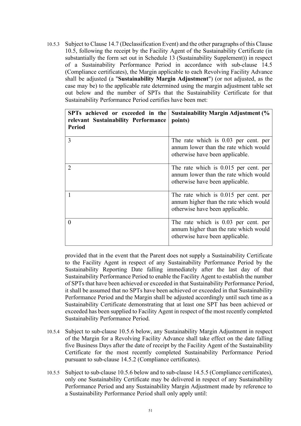 51 10.5.3 Subject to Clause 14.7 (Declassification Event) and the other paragraphs of this Clause 10.5, following the receipt by the Facility Agent of the Sustainability Certificate (in substantially the form set out in Schedule 13 (Sustainability Supplement)) in respect of a Sustainability Performance Period in accordance with sub-clause 14.5 (Compliance certificates), the Margin applicable to each Revolving Facility Advance shall be adjusted (a "Sustainability Margin Adjustment") (or not adjusted, as the case may be) to the applicable rate determined using the margin adjustment table set out below and the number of SPTs that the Sustainability Certificate for that Sustainability Performance Period certifies have been met: SPTs achieved or exceeded in the relevant Sustainability Performance Period Sustainability Margin Adjustment (% points) 3 The rate which is 0.03 per cent. per annum lower than the rate which would otherwise have been applicable. 2 The rate which is 0.015 per cent. per annum lower than the rate which would otherwise have been applicable. 1 The rate which is 0.015 per cent. per annum higher than the rate which would otherwise have been applicable. 0 The rate which is 0.03 per cent. per annum higher than the rate which would otherwise have been applicable. provided that in the event that the Parent does not supply a Sustainability Certificate to the Facility Agent in respect of any Sustainability Performance Period by the Sustainability Reporting Date falling immediately after the last day of that Sustainability Performance Period to enable the Facility Agent to establish the number of SPTs that have been achieved or exceeded in that Sustainability Performance Period, it shall be assumed that no SPTs have been achieved or exceeded in that Sustainability Performance Period and the Margin shall be adjusted accordingly until such time as a Sustainability Certificate demonstrating that at least one SPT has been achieved or exceeded has been supplied to Facility Agent in respect of the most recently completed Sustainability Performance Period. 10.5.4 Subject to sub-clause 10.5.6 below, any Sustainability Margin Adjustment in respect of the Margin for a Revolving Facility Advance shall take effect on the date falling five Business Days after the date of receipt by the Facility Agent of the Sustainability Certificate for the most recently completed Sustainability Performance Period pursuant to sub-clause 14.5.2 (Compliance certificates). 10.5.5 Subject to sub-clause 10.5.6 below and to sub-clause 14.5.5 (Compliance certificates), only one Sustainability Certificate may be delivered in respect of any Sustainability Performance Period and any Sustainability Margin Adjustment made by reference to a Sustainability Performance Period shall only apply until: