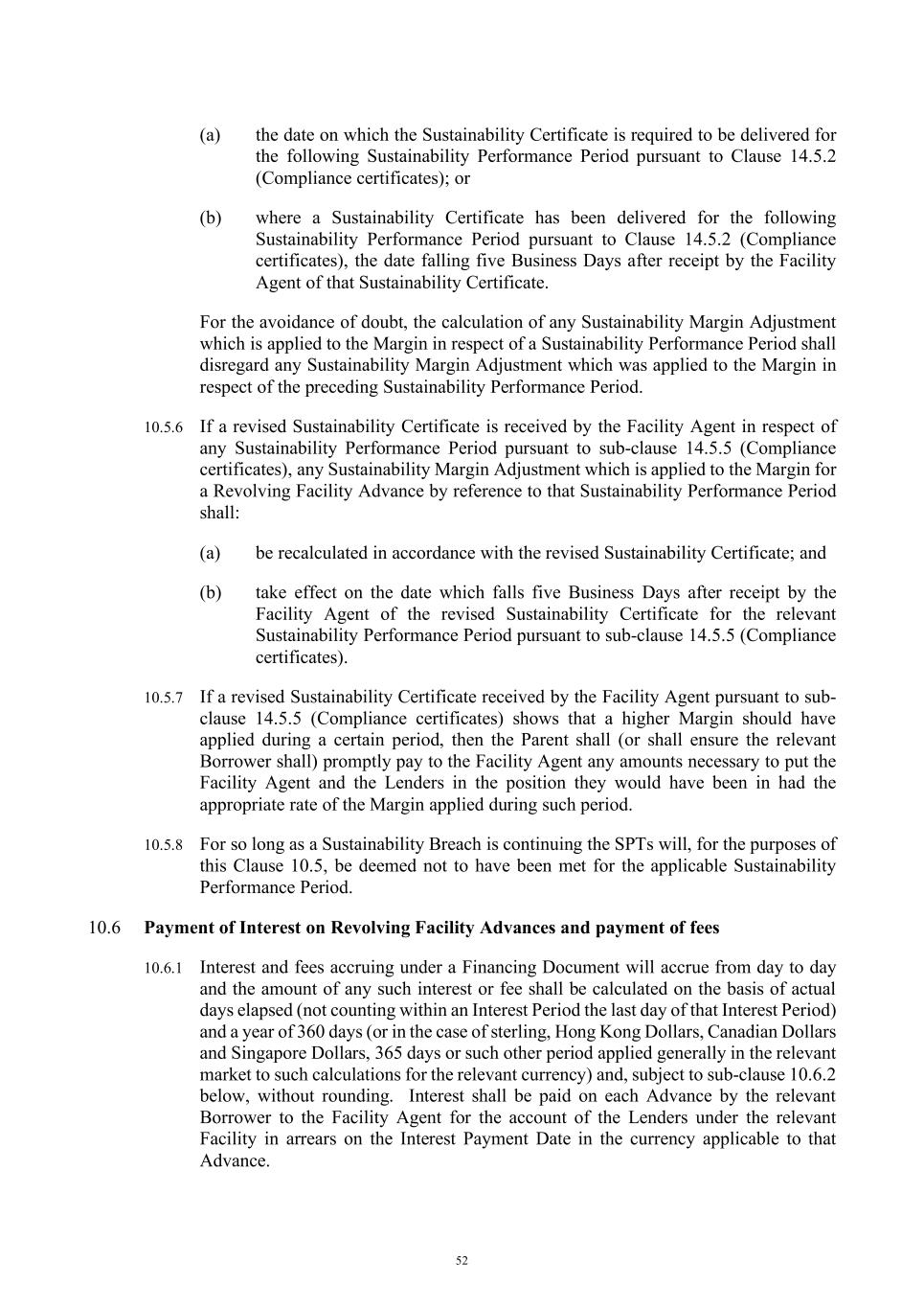 52 (a) the date on which the Sustainability Certificate is required to be delivered for the following Sustainability Performance Period pursuant to Clause 14.5.2 (Compliance certificates); or (b) where a Sustainability Certificate has been delivered for the following Sustainability Performance Period pursuant to Clause 14.5.2 (Compliance certificates), the date falling five Business Days after receipt by the Facility Agent of that Sustainability Certificate. For the avoidance of doubt, the calculation of any Sustainability Margin Adjustment which is applied to the Margin in respect of a Sustainability Performance Period shall disregard any Sustainability Margin Adjustment which was applied to the Margin in respect of the preceding Sustainability Performance Period. 10.5.6 If a revised Sustainability Certificate is received by the Facility Agent in respect of any Sustainability Performance Period pursuant to sub-clause 14.5.5 (Compliance certificates), any Sustainability Margin Adjustment which is applied to the Margin for a Revolving Facility Advance by reference to that Sustainability Performance Period shall: (a) be recalculated in accordance with the revised Sustainability Certificate; and (b) take effect on the date which falls five Business Days after receipt by the Facility Agent of the revised Sustainability Certificate for the relevant Sustainability Performance Period pursuant to sub-clause 14.5.5 (Compliance certificates). 10.5.7 If a revised Sustainability Certificate received by the Facility Agent pursuant to sub- clause 14.5.5 (Compliance certificates) shows that a higher Margin should have applied during a certain period, then the Parent shall (or shall ensure the relevant Borrower shall) promptly pay to the Facility Agent any amounts necessary to put the Facility Agent and the Lenders in the position they would have been in had the appropriate rate of the Margin applied during such period. 10.5.8 For so long as a Sustainability Breach is continuing the SPTs will, for the purposes of this Clause 10.5, be deemed not to have been met for the applicable Sustainability Performance Period. 10.6 Payment of Interest on Revolving Facility Advances and payment of fees 10.6.1 Interest and fees accruing under a Financing Document will accrue from day to day and the amount of any such interest or fee shall be calculated on the basis of actual days elapsed (not counting within an Interest Period the last day of that Interest Period) and a year of 360 days (or in the case of sterling, Hong Kong Dollars, Canadian Dollars and Singapore Dollars, 365 days or such other period applied generally in the relevant market to such calculations for the relevant currency) and, subject to sub-clause 10.6.2 below, without rounding. Interest shall be paid on each Advance by the relevant Borrower to the Facility Agent for the account of the Lenders under the relevant Facility in arrears on the Interest Payment Date in the currency applicable to that Advance.