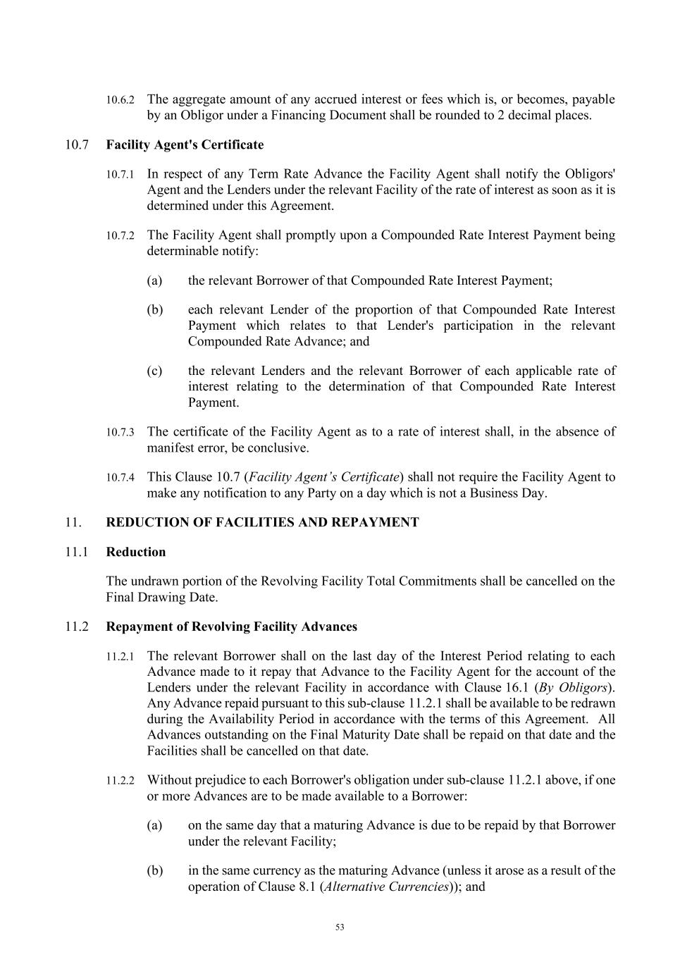 53 10.6.2 The aggregate amount of any accrued interest or fees which is, or becomes, payable by an Obligor under a Financing Document shall be rounded to 2 decimal places. 10.7 Facility Agent's Certificate 10.7.1 In respect of any Term Rate Advance the Facility Agent shall notify the Obligors' Agent and the Lenders under the relevant Facility of the rate of interest as soon as it is determined under this Agreement. 10.7.2 The Facility Agent shall promptly upon a Compounded Rate Interest Payment being determinable notify: (a) the relevant Borrower of that Compounded Rate Interest Payment; (b) each relevant Lender of the proportion of that Compounded Rate Interest Payment which relates to that Lender's participation in the relevant Compounded Rate Advance; and (c) the relevant Lenders and the relevant Borrower of each applicable rate of interest relating to the determination of that Compounded Rate Interest Payment. 10.7.3 The certificate of the Facility Agent as to a rate of interest shall, in the absence of manifest error, be conclusive. 10.7.4 This Clause 10.7 (Facility Agent’s Certificate) shall not require the Facility Agent to make any notification to any Party on a day which is not a Business Day. 11. REDUCTION OF FACILITIES AND REPAYMENT 11.1 Reduction The undrawn portion of the Revolving Facility Total Commitments shall be cancelled on the Final Drawing Date. 11.2 Repayment of Revolving Facility Advances 11.2.1 The relevant Borrower shall on the last day of the Interest Period relating to each Advance made to it repay that Advance to the Facility Agent for the account of the Lenders under the relevant Facility in accordance with Clause 16.1 (By Obligors). Any Advance repaid pursuant to this sub-clause 11.2.1 shall be available to be redrawn during the Availability Period in accordance with the terms of this Agreement. All Advances outstanding on the Final Maturity Date shall be repaid on that date and the Facilities shall be cancelled on that date. 11.2.2 Without prejudice to each Borrower's obligation under sub-clause 11.2.1 above, if one or more Advances are to be made available to a Borrower: (a) on the same day that a maturing Advance is due to be repaid by that Borrower under the relevant Facility; (b) in the same currency as the maturing Advance (unless it arose as a result of the operation of Clause 8.1 (Alternative Currencies)); and