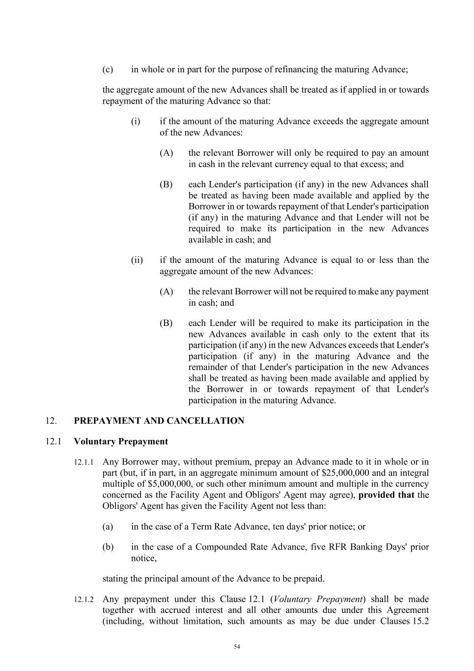 54 (c) in whole or in part for the purpose of refinancing the maturing Advance; the aggregate amount of the new Advances shall be treated as if applied in or towards repayment of the maturing Advance so that: (i) if the amount of the maturing Advance exceeds the aggregate amount of the new Advances: (A) the relevant Borrower will only be required to pay an amount in cash in the relevant currency equal to that excess; and (B) each Lender's participation (if any) in the new Advances shall be treated as having been made available and applied by the Borrower in or towards repayment of that Lender's participation (if any) in the maturing Advance and that Lender will not be required to make its participation in the new Advances available in cash; and (ii) if the amount of the maturing Advance is equal to or less than the aggregate amount of the new Advances: (A) the relevant Borrower will not be required to make any payment in cash; and (B) each Lender will be required to make its participation in the new Advances available in cash only to the extent that its participation (if any) in the new Advances exceeds that Lender's participation (if any) in the maturing Advance and the remainder of that Lender's participation in the new Advances shall be treated as having been made available and applied by the Borrower in or towards repayment of that Lender's participation in the maturing Advance. 12. PREPAYMENT AND CANCELLATION 12.1 Voluntary Prepayment 12.1.1 Any Borrower may, without premium, prepay an Advance made to it in whole or in part (but, if in part, in an aggregate minimum amount of $25,000,000 and an integral multiple of $5,000,000, or such other minimum amount and multiple in the currency concerned as the Facility Agent and Obligors' Agent may agree), provided that the Obligors' Agent has given the Facility Agent not less than: (a) in the case of a Term Rate Advance, ten days' prior notice; or (b) in the case of a Compounded Rate Advance, five RFR Banking Days' prior notice, stating the principal amount of the Advance to be prepaid. 12.1.2 Any prepayment under this Clause 12.1 (Voluntary Prepayment) shall be made together with accrued interest and all other amounts due under this Agreement (including, without limitation, such amounts as may be due under Clauses 15.2