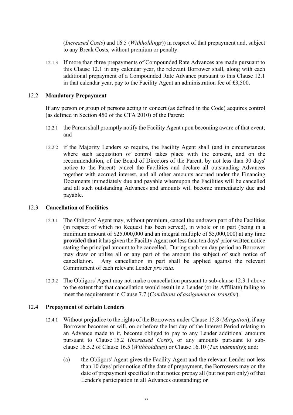55 (Increased Costs) and 16.5 (Withholdings)) in respect of that prepayment and, subject to any Break Costs, without premium or penalty. 12.1.3 If more than three prepayments of Compounded Rate Advances are made pursuant to this Clause 12.1 in any calendar year, the relevant Borrower shall, along with each additional prepayment of a Compounded Rate Advance pursuant to this Clause 12.1 in that calendar year, pay to the Facility Agent an administration fee of £3,500. 12.2 Mandatory Prepayment If any person or group of persons acting in concert (as defined in the Code) acquires control (as defined in Section 450 of the CTA 2010) of the Parent: 12.2.1 the Parent shall promptly notify the Facility Agent upon becoming aware of that event; and 12.2.2 if the Majority Lenders so require, the Facility Agent shall (and in circumstances where such acquisition of control takes place with the consent, and on the recommendation, of the Board of Directors of the Parent, by not less than 30 days' notice to the Parent) cancel the Facilities and declare all outstanding Advances together with accrued interest, and all other amounts accrued under the Financing Documents immediately due and payable whereupon the Facilities will be cancelled and all such outstanding Advances and amounts will become immediately due and payable. 12.3 Cancellation of Facilities 12.3.1 The Obligors' Agent may, without premium, cancel the undrawn part of the Facilities (in respect of which no Request has been served), in whole or in part (being in a minimum amount of $25,000,000 and an integral multiple of $5,000,000) at any time provided that it has given the Facility Agent not less than ten days' prior written notice stating the principal amount to be cancelled. During such ten day period no Borrower may draw or utilise all or any part of the amount the subject of such notice of cancellation. Any cancellation in part shall be applied against the relevant Commitment of each relevant Lender pro rata. 12.3.2 The Obligors' Agent may not make a cancellation pursuant to sub-clause 12.3.1 above to the extent that that cancellation would result in a Lender (or its Affiliate) failing to meet the requirement in Clause 7.7 (Conditions of assignment or transfer). 12.4 Prepayment of certain Lenders 12.4.1 Without prejudice to the rights of the Borrowers under Clause 15.8 (Mitigation), if any Borrower becomes or will, on or before the last day of the Interest Period relating to an Advance made to it, become obliged to pay to any Lender additional amounts pursuant to Clause 15.2 (Increased Costs), or any amounts pursuant to sub- clause 16.5.2 of Clause 16.5 (Withholdings) or Clause 16.10 (Tax indemnity); and: (a) the Obligors' Agent gives the Facility Agent and the relevant Lender not less than 10 days' prior notice of the date of prepayment, the Borrowers may on the date of prepayment specified in that notice prepay all (but not part only) of that Lender's participation in all Advances outstanding; or