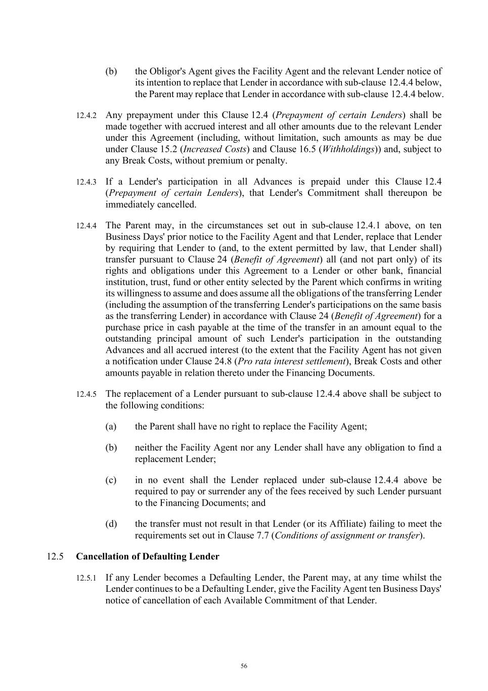 56 (b) the Obligor's Agent gives the Facility Agent and the relevant Lender notice of its intention to replace that Lender in accordance with sub-clause 12.4.4 below, the Parent may replace that Lender in accordance with sub-clause 12.4.4 below. 12.4.2 Any prepayment under this Clause 12.4 (Prepayment of certain Lenders) shall be made together with accrued interest and all other amounts due to the relevant Lender under this Agreement (including, without limitation, such amounts as may be due under Clause 15.2 (Increased Costs) and Clause 16.5 (Withholdings)) and, subject to any Break Costs, without premium or penalty. 12.4.3 If a Lender's participation in all Advances is prepaid under this Clause 12.4 (Prepayment of certain Lenders), that Lender's Commitment shall thereupon be immediately cancelled. 12.4.4 The Parent may, in the circumstances set out in sub-clause 12.4.1 above, on ten Business Days' prior notice to the Facility Agent and that Lender, replace that Lender by requiring that Lender to (and, to the extent permitted by law, that Lender shall) transfer pursuant to Clause 24 (Benefit of Agreement) all (and not part only) of its rights and obligations under this Agreement to a Lender or other bank, financial institution, trust, fund or other entity selected by the Parent which confirms in writing its willingness to assume and does assume all the obligations of the transferring Lender (including the assumption of the transferring Lender's participations on the same basis as the transferring Lender) in accordance with Clause 24 (Benefit of Agreement) for a purchase price in cash payable at the time of the transfer in an amount equal to the outstanding principal amount of such Lender's participation in the outstanding Advances and all accrued interest (to the extent that the Facility Agent has not given a notification under Clause 24.8 (Pro rata interest settlement), Break Costs and other amounts payable in relation thereto under the Financing Documents. 12.4.5 The replacement of a Lender pursuant to sub-clause 12.4.4 above shall be subject to the following conditions: (a) the Parent shall have no right to replace the Facility Agent; (b) neither the Facility Agent nor any Lender shall have any obligation to find a replacement Lender; (c) in no event shall the Lender replaced under sub-clause 12.4.4 above be required to pay or surrender any of the fees received by such Lender pursuant to the Financing Documents; and (d) the transfer must not result in that Lender (or its Affiliate) failing to meet the requirements set out in Clause 7.7 (Conditions of assignment or transfer). 12.5 Cancellation of Defaulting Lender 12.5.1 If any Lender becomes a Defaulting Lender, the Parent may, at any time whilst the Lender continues to be a Defaulting Lender, give the Facility Agent ten Business Days' notice of cancellation of each Available Commitment of that Lender.