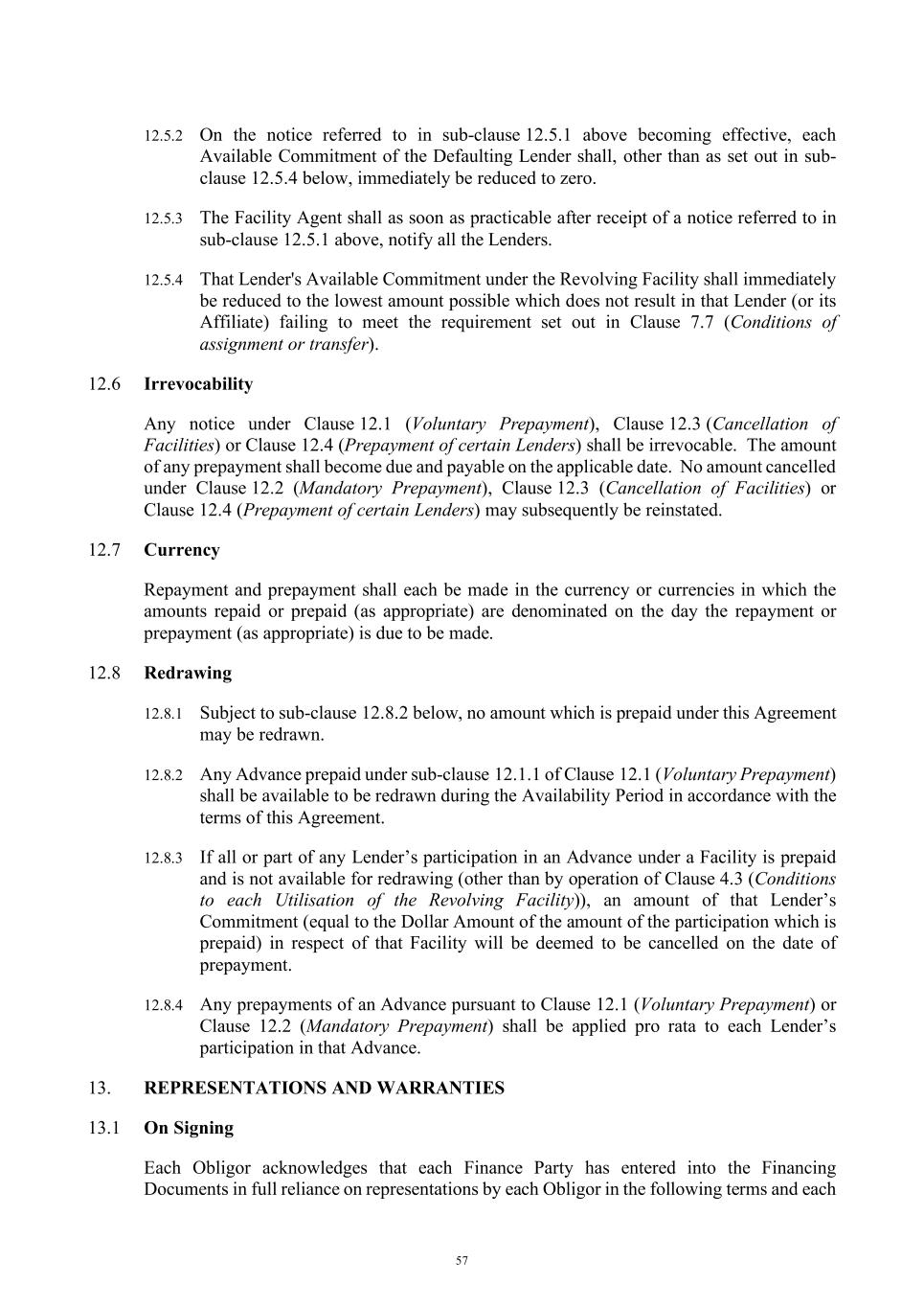 57 12.5.2 On the notice referred to in sub-clause 12.5.1 above becoming effective, each Available Commitment of the Defaulting Lender shall, other than as set out in sub- clause 12.5.4 below, immediately be reduced to zero. 12.5.3 The Facility Agent shall as soon as practicable after receipt of a notice referred to in sub-clause 12.5.1 above, notify all the Lenders. 12.5.4 That Lender's Available Commitment under the Revolving Facility shall immediately be reduced to the lowest amount possible which does not result in that Lender (or its Affiliate) failing to meet the requirement set out in Clause 7.7 (Conditions of assignment or transfer). 12.6 Irrevocability Any notice under Clause 12.1 (Voluntary Prepayment), Clause 12.3 (Cancellation of Facilities) or Clause 12.4 (Prepayment of certain Lenders) shall be irrevocable. The amount of any prepayment shall become due and payable on the applicable date. No amount cancelled under Clause 12.2 (Mandatory Prepayment), Clause 12.3 (Cancellation of Facilities) or Clause 12.4 (Prepayment of certain Lenders) may subsequently be reinstated. 12.7 Currency Repayment and prepayment shall each be made in the currency or currencies in which the amounts repaid or prepaid (as appropriate) are denominated on the day the repayment or prepayment (as appropriate) is due to be made. 12.8 Redrawing 12.8.1 Subject to sub-clause 12.8.2 below, no amount which is prepaid under this Agreement may be redrawn. 12.8.2 Any Advance prepaid under sub-clause 12.1.1 of Clause 12.1 (Voluntary Prepayment) shall be available to be redrawn during the Availability Period in accordance with the terms of this Agreement. 12.8.3 If all or part of any Lender’s participation in an Advance under a Facility is prepaid and is not available for redrawing (other than by operation of Clause 4.3 (Conditions to each Utilisation of the Revolving Facility)), an amount of that Lender’s Commitment (equal to the Dollar Amount of the amount of the participation which is prepaid) in respect of that Facility will be deemed to be cancelled on the date of prepayment. 12.8.4 Any prepayments of an Advance pursuant to Clause 12.1 (Voluntary Prepayment) or Clause 12.2 (Mandatory Prepayment) shall be applied pro rata to each Lender’s participation in that Advance. 13. REPRESENTATIONS AND WARRANTIES 13.1 On Signing Each Obligor acknowledges that each Finance Party has entered into the Financing Documents in full reliance on representations by each Obligor in the following terms and each
