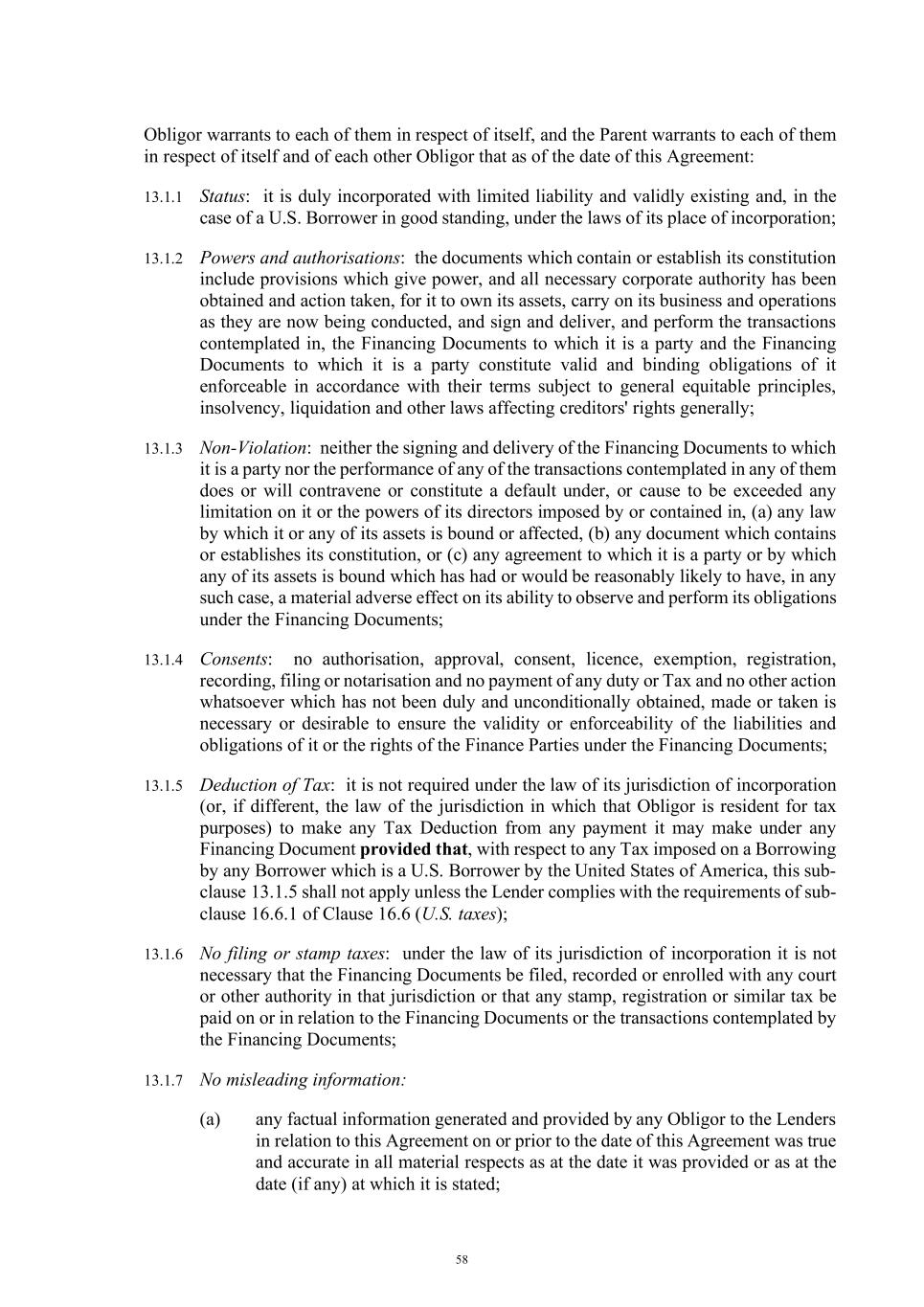 58 Obligor warrants to each of them in respect of itself, and the Parent warrants to each of them in respect of itself and of each other Obligor that as of the date of this Agreement: 13.1.1 Status: it is duly incorporated with limited liability and validly existing and, in the case of a U.S. Borrower in good standing, under the laws of its place of incorporation; 13.1.2 Powers and authorisations: the documents which contain or establish its constitution include provisions which give power, and all necessary corporate authority has been obtained and action taken, for it to own its assets, carry on its business and operations as they are now being conducted, and sign and deliver, and perform the transactions contemplated in, the Financing Documents to which it is a party and the Financing Documents to which it is a party constitute valid and binding obligations of it enforceable in accordance with their terms subject to general equitable principles, insolvency, liquidation and other laws affecting creditors' rights generally; 13.1.3 Non-Violation: neither the signing and delivery of the Financing Documents to which it is a party nor the performance of any of the transactions contemplated in any of them does or will contravene or constitute a default under, or cause to be exceeded any limitation on it or the powers of its directors imposed by or contained in, (a) any law by which it or any of its assets is bound or affected, (b) any document which contains or establishes its constitution, or (c) any agreement to which it is a party or by which any of its assets is bound which has had or would be reasonably likely to have, in any such case, a material adverse effect on its ability to observe and perform its obligations under the Financing Documents; 13.1.4 Consents: no authorisation, approval, consent, licence, exemption, registration, recording, filing or notarisation and no payment of any duty or Tax and no other action whatsoever which has not been duly and unconditionally obtained, made or taken is necessary or desirable to ensure the validity or enforceability of the liabilities and obligations of it or the rights of the Finance Parties under the Financing Documents; 13.1.5 Deduction of Tax: it is not required under the law of its jurisdiction of incorporation (or, if different, the law of the jurisdiction in which that Obligor is resident for tax purposes) to make any Tax Deduction from any payment it may make under any Financing Document provided that, with respect to any Tax imposed on a Borrowing by any Borrower which is a U.S. Borrower by the United States of America, this sub- clause 13.1.5 shall not apply unless the Lender complies with the requirements of sub- clause 16.6.1 of Clause 16.6 (U.S. taxes); 13.1.6 No filing or stamp taxes: under the law of its jurisdiction of incorporation it is not necessary that the Financing Documents be filed, recorded or enrolled with any court or other authority in that jurisdiction or that any stamp, registration or similar tax be paid on or in relation to the Financing Documents or the transactions contemplated by the Financing Documents; 13.1.7 No misleading information: (a) any factual information generated and provided by any Obligor to the Lenders in relation to this Agreement on or prior to the date of this Agreement was true and accurate in all material respects as at the date it was provided or as at the date (if any) at which it is stated;