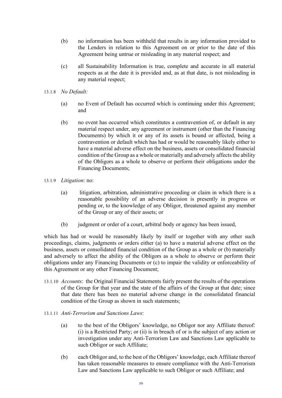 59 (b) no information has been withheld that results in any information provided to the Lenders in relation to this Agreement on or prior to the date of this Agreement being untrue or misleading in any material respect; and (c) all Sustainability Information is true, complete and accurate in all material respects as at the date it is provided and, as at that date, is not misleading in any material respect; 13.1.8 No Default: (a) no Event of Default has occurred which is continuing under this Agreement; and (b) no event has occurred which constitutes a contravention of, or default in any material respect under, any agreement or instrument (other than the Financing Documents) by which it or any of its assets is bound or affected, being a contravention or default which has had or would be reasonably likely either to have a material adverse effect on the business, assets or consolidated financial condition of the Group as a whole or materially and adversely affects the ability of the Obligors as a whole to observe or perform their obligations under the Financing Documents; 13.1.9 Litigation: no: (a) litigation, arbitration, administrative proceeding or claim in which there is a reasonable possibility of an adverse decision is presently in progress or pending or, to the knowledge of any Obligor, threatened against any member of the Group or any of their assets; or (b) judgment or order of a court, arbitral body or agency has been issued, which has had or would be reasonably likely by itself or together with any other such proceedings, claims, judgments or orders either (a) to have a material adverse effect on the business, assets or consolidated financial condition of the Group as a whole or (b) materially and adversely to affect the ability of the Obligors as a whole to observe or perform their obligations under any Financing Documents or (c) to impair the validity or enforceability of this Agreement or any other Financing Document; 13.1.10 Accounts: the Original Financial Statements fairly present the results of the operations of the Group for that year and the state of the affairs of the Group at that date; since that date there has been no material adverse change in the consolidated financial condition of the Group as shown in such statements; 13.1.11 Anti-Terrorism and Sanctions Laws: (a) to the best of the Obligors’ knowledge, no Obligor nor any Affiliate thereof: (i) is a Restricted Party; or (ii) is in breach of or is the subject of any action or investigation under any Anti-Terrorism Law and Sanctions Law applicable to such Obligor or such Affiliate; (b) each Obligor and, to the best of the Obligors’ knowledge, each Affiliate thereof has taken reasonable measures to ensure compliance with the Anti-Terrorism Law and Sanctions Law applicable to such Obligor or such Affiliate; and