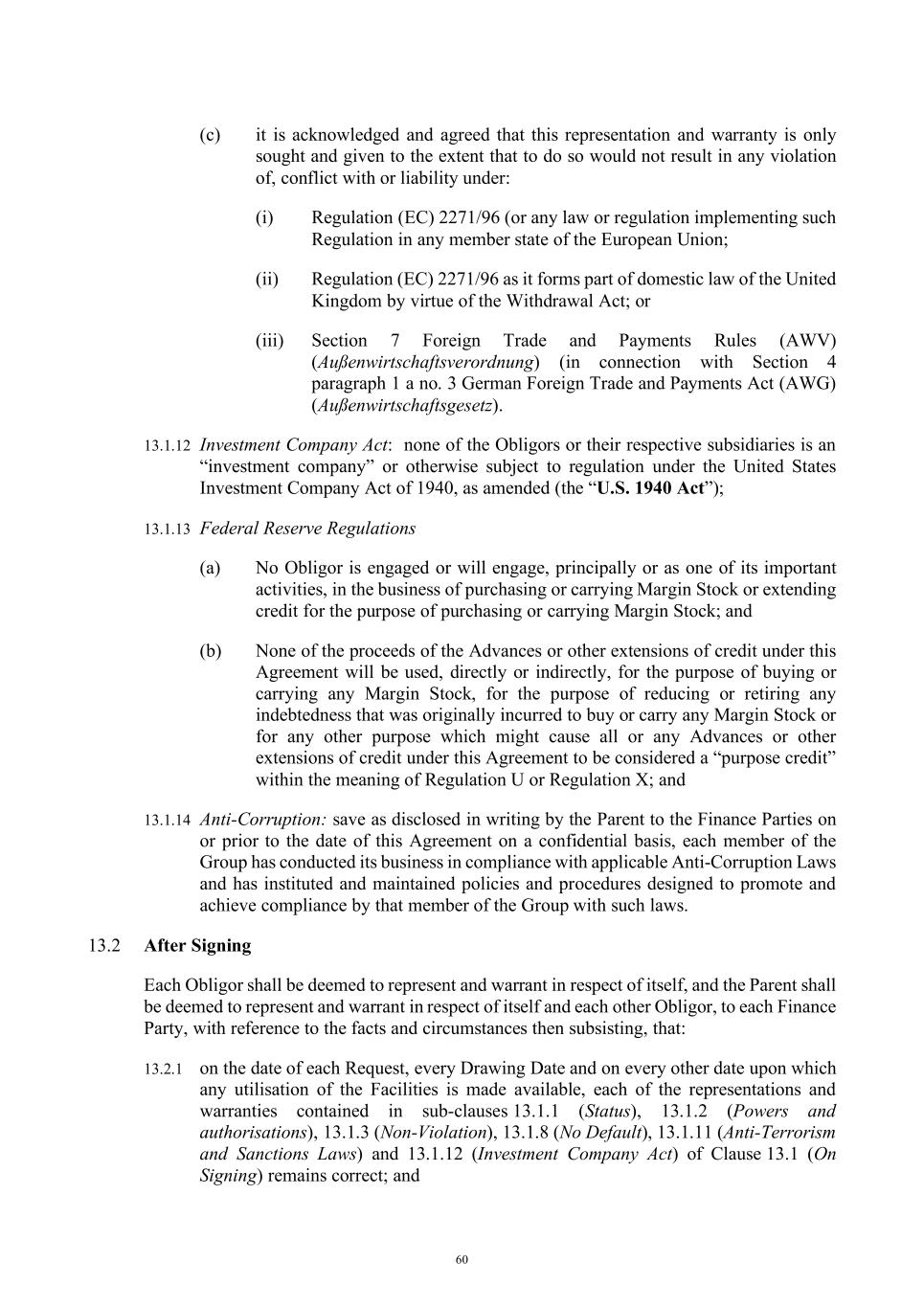 60 (c) it is acknowledged and agreed that this representation and warranty is only sought and given to the extent that to do so would not result in any violation of, conflict with or liability under: (i) Regulation (EC) 2271/96 (or any law or regulation implementing such Regulation in any member state of the European Union; (ii) Regulation (EC) 2271/96 as it forms part of domestic law of the United Kingdom by virtue of the Withdrawal Act; or (iii) Section 7 Foreign Trade and Payments Rules (AWV) (Außenwirtschaftsverordnung) (in connection with Section 4 paragraph 1 a no. 3 German Foreign Trade and Payments Act (AWG) (Außenwirtschaftsgesetz). 13.1.12 Investment Company Act: none of the Obligors or their respective subsidiaries is an “investment company” or otherwise subject to regulation under the United States Investment Company Act of 1940, as amended (the “U.S. 1940 Act”); 13.1.13 Federal Reserve Regulations (a) No Obligor is engaged or will engage, principally or as one of its important activities, in the business of purchasing or carrying Margin Stock or extending credit for the purpose of purchasing or carrying Margin Stock; and (b) None of the proceeds of the Advances or other extensions of credit under this Agreement will be used, directly or indirectly, for the purpose of buying or carrying any Margin Stock, for the purpose of reducing or retiring any indebtedness that was originally incurred to buy or carry any Margin Stock or for any other purpose which might cause all or any Advances or other extensions of credit under this Agreement to be considered a “purpose credit” within the meaning of Regulation U or Regulation X; and 13.1.14 Anti-Corruption: save as disclosed in writing by the Parent to the Finance Parties on or prior to the date of this Agreement on a confidential basis, each member of the Group has conducted its business in compliance with applicable Anti-Corruption Laws and has instituted and maintained policies and procedures designed to promote and achieve compliance by that member of the Group with such laws. 13.2 After Signing Each Obligor shall be deemed to represent and warrant in respect of itself, and the Parent shall be deemed to represent and warrant in respect of itself and each other Obligor, to each Finance Party, with reference to the facts and circumstances then subsisting, that: 13.2.1 on the date of each Request, every Drawing Date and on every other date upon which any utilisation of the Facilities is made available, each of the representations and warranties contained in sub-clauses 13.1.1 (Status), 13.1.2 (Powers and authorisations), 13.1.3 (Non-Violation), 13.1.8 (No Default), 13.1.11 (Anti-Terrorism and Sanctions Laws) and 13.1.12 (Investment Company Act) of Clause 13.1 (On Signing) remains correct; and