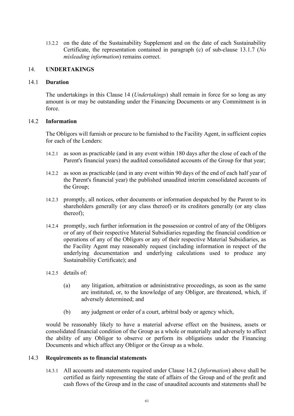 61 13.2.2 on the date of the Sustainability Supplement and on the date of each Sustainability Certificate, the representation contained in paragraph (c) of sub-clause 13.1.7 (No misleading information) remains correct. 14. UNDERTAKINGS 14.1 Duration The undertakings in this Clause 14 (Undertakings) shall remain in force for so long as any amount is or may be outstanding under the Financing Documents or any Commitment is in force. 14.2 Information The Obligors will furnish or procure to be furnished to the Facility Agent, in sufficient copies for each of the Lenders: 14.2.1 as soon as practicable (and in any event within 180 days after the close of each of the Parent's financial years) the audited consolidated accounts of the Group for that year; 14.2.2 as soon as practicable (and in any event within 90 days of the end of each half year of the Parent's financial year) the published unaudited interim consolidated accounts of the Group; 14.2.3 promptly, all notices, other documents or information despatched by the Parent to its shareholders generally (or any class thereof) or its creditors generally (or any class thereof); 14.2.4 promptly, such further information in the possession or control of any of the Obligors or of any of their respective Material Subsidiaries regarding the financial condition or operations of any of the Obligors or any of their respective Material Subsidiaries, as the Facility Agent may reasonably request (including information in respect of the underlying documentation and underlying calculations used to produce any Sustainability Certificate); and 14.2.5 details of: (a) any litigation, arbitration or administrative proceedings, as soon as the same are instituted, or, to the knowledge of any Obligor, are threatened, which, if adversely determined; and (b) any judgment or order of a court, arbitral body or agency which, would be reasonably likely to have a material adverse effect on the business, assets or consolidated financial condition of the Group as a whole or materially and adversely to affect the ability of any Obligor to observe or perform its obligations under the Financing Documents and which affect any Obligor or the Group as a whole. 14.3 Requirements as to financial statements 14.3.1 All accounts and statements required under Clause 14.2 (Information) above shall be certified as fairly representing the state of affairs of the Group and of the profit and cash flows of the Group and in the case of unaudited accounts and statements shall be