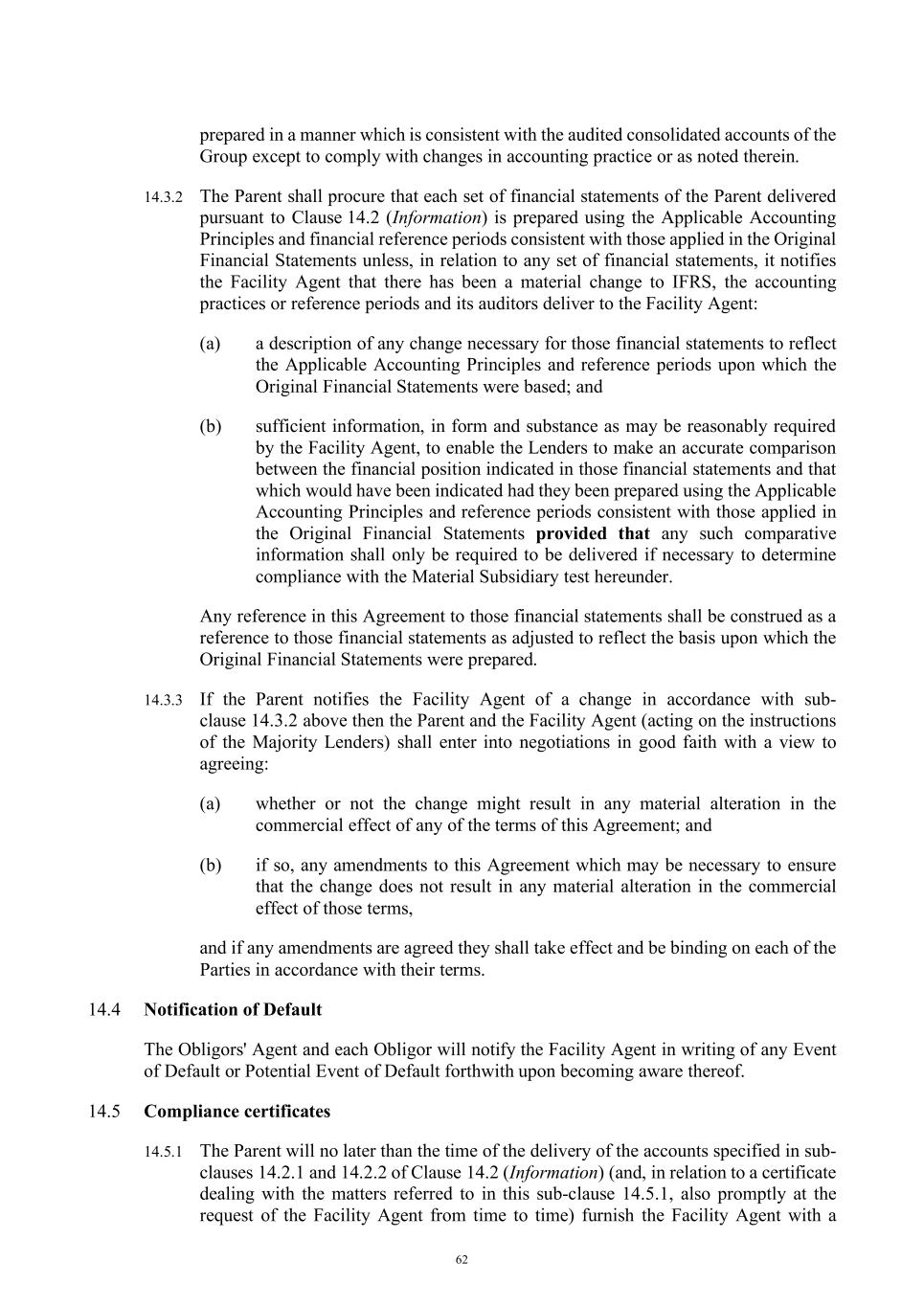 62 prepared in a manner which is consistent with the audited consolidated accounts of the Group except to comply with changes in accounting practice or as noted therein. 14.3.2 The Parent shall procure that each set of financial statements of the Parent delivered pursuant to Clause 14.2 (Information) is prepared using the Applicable Accounting Principles and financial reference periods consistent with those applied in the Original Financial Statements unless, in relation to any set of financial statements, it notifies the Facility Agent that there has been a material change to IFRS, the accounting practices or reference periods and its auditors deliver to the Facility Agent: (a) a description of any change necessary for those financial statements to reflect the Applicable Accounting Principles and reference periods upon which the Original Financial Statements were based; and (b) sufficient information, in form and substance as may be reasonably required by the Facility Agent, to enable the Lenders to make an accurate comparison between the financial position indicated in those financial statements and that which would have been indicated had they been prepared using the Applicable Accounting Principles and reference periods consistent with those applied in the Original Financial Statements provided that any such comparative information shall only be required to be delivered if necessary to determine compliance with the Material Subsidiary test hereunder. Any reference in this Agreement to those financial statements shall be construed as a reference to those financial statements as adjusted to reflect the basis upon which the Original Financial Statements were prepared. 14.3.3 If the Parent notifies the Facility Agent of a change in accordance with sub- clause 14.3.2 above then the Parent and the Facility Agent (acting on the instructions of the Majority Lenders) shall enter into negotiations in good faith with a view to agreeing: (a) whether or not the change might result in any material alteration in the commercial effect of any of the terms of this Agreement; and (b) if so, any amendments to this Agreement which may be necessary to ensure that the change does not result in any material alteration in the commercial effect of those terms, and if any amendments are agreed they shall take effect and be binding on each of the Parties in accordance with their terms. 14.4 Notification of Default The Obligors' Agent and each Obligor will notify the Facility Agent in writing of any Event of Default or Potential Event of Default forthwith upon becoming aware thereof. 14.5 Compliance certificates 14.5.1 The Parent will no later than the time of the delivery of the accounts specified in sub- clauses 14.2.1 and 14.2.2 of Clause 14.2 (Information) (and, in relation to a certificate dealing with the matters referred to in this sub-clause 14.5.1, also promptly at the request of the Facility Agent from time to time) furnish the Facility Agent with a