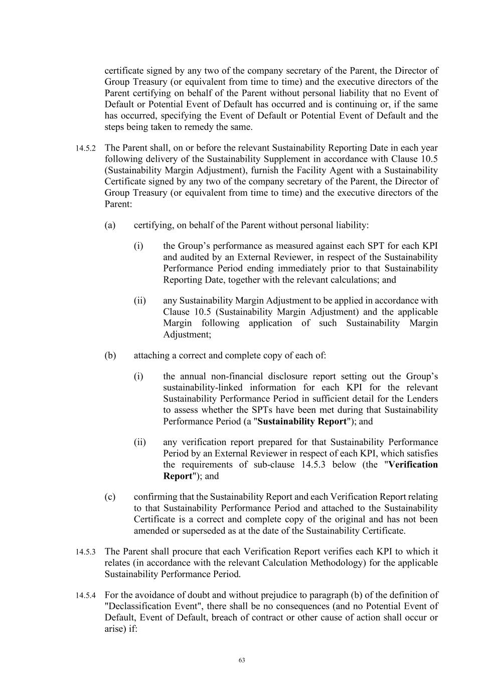 63 certificate signed by any two of the company secretary of the Parent, the Director of Group Treasury (or equivalent from time to time) and the executive directors of the Parent certifying on behalf of the Parent without personal liability that no Event of Default or Potential Event of Default has occurred and is continuing or, if the same has occurred, specifying the Event of Default or Potential Event of Default and the steps being taken to remedy the same. 14.5.2 The Parent shall, on or before the relevant Sustainability Reporting Date in each year following delivery of the Sustainability Supplement in accordance with Clause 10.5 (Sustainability Margin Adjustment), furnish the Facility Agent with a Sustainability Certificate signed by any two of the company secretary of the Parent, the Director of Group Treasury (or equivalent from time to time) and the executive directors of the Parent: (a) certifying, on behalf of the Parent without personal liability: (i) the Group’s performance as measured against each SPT for each KPI and audited by an External Reviewer, in respect of the Sustainability Performance Period ending immediately prior to that Sustainability Reporting Date, together with the relevant calculations; and (ii) any Sustainability Margin Adjustment to be applied in accordance with Clause 10.5 (Sustainability Margin Adjustment) and the applicable Margin following application of such Sustainability Margin Adjustment; (b) attaching a correct and complete copy of each of: (i) the annual non-financial disclosure report setting out the Group’s sustainability-linked information for each KPI for the relevant Sustainability Performance Period in sufficient detail for the Lenders to assess whether the SPTs have been met during that Sustainability Performance Period (a "Sustainability Report"); and (ii) any verification report prepared for that Sustainability Performance Period by an External Reviewer in respect of each KPI, which satisfies the requirements of sub-clause 14.5.3 below (the "Verification Report"); and (c) confirming that the Sustainability Report and each Verification Report relating to that Sustainability Performance Period and attached to the Sustainability Certificate is a correct and complete copy of the original and has not been amended or superseded as at the date of the Sustainability Certificate. 14.5.3 The Parent shall procure that each Verification Report verifies each KPI to which it relates (in accordance with the relevant Calculation Methodology) for the applicable Sustainability Performance Period. 14.5.4 For the avoidance of doubt and without prejudice to paragraph (b) of the definition of "Declassification Event", there shall be no consequences (and no Potential Event of Default, Event of Default, breach of contract or other cause of action shall occur or arise) if: