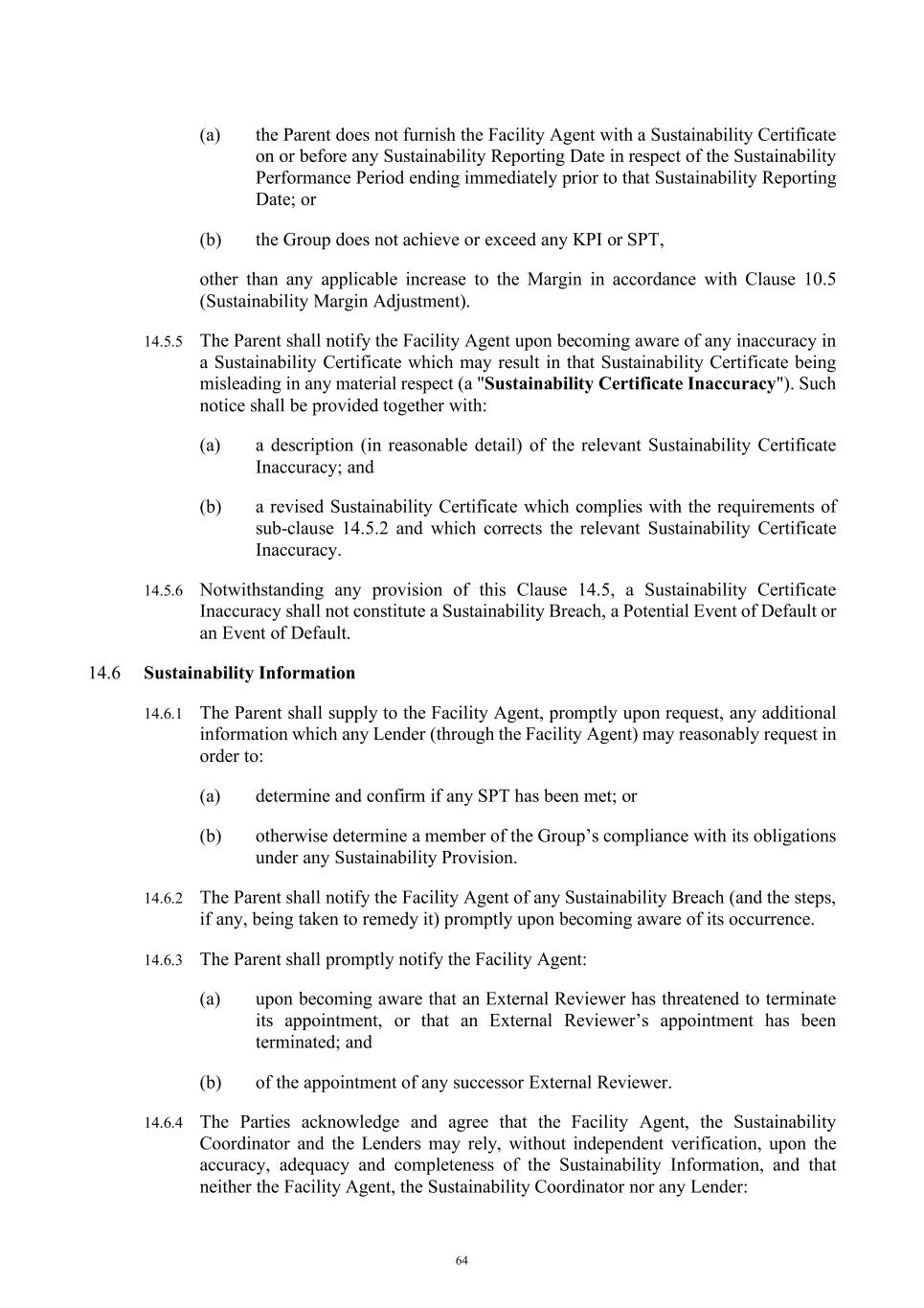 64 (a) the Parent does not furnish the Facility Agent with a Sustainability Certificate on or before any Sustainability Reporting Date in respect of the Sustainability Performance Period ending immediately prior to that Sustainability Reporting Date; or (b) the Group does not achieve or exceed any KPI or SPT, other than any applicable increase to the Margin in accordance with Clause 10.5 (Sustainability Margin Adjustment). 14.5.5 The Parent shall notify the Facility Agent upon becoming aware of any inaccuracy in a Sustainability Certificate which may result in that Sustainability Certificate being misleading in any material respect (a "Sustainability Certificate Inaccuracy"). Such notice shall be provided together with: (a) a description (in reasonable detail) of the relevant Sustainability Certificate Inaccuracy; and (b) a revised Sustainability Certificate which complies with the requirements of sub-clause 14.5.2 and which corrects the relevant Sustainability Certificate Inaccuracy. 14.5.6 Notwithstanding any provision of this Clause 14.5, a Sustainability Certificate Inaccuracy shall not constitute a Sustainability Breach, a Potential Event of Default or an Event of Default. 14.6 Sustainability Information 14.6.1 The Parent shall supply to the Facility Agent, promptly upon request, any additional information which any Lender (through the Facility Agent) may reasonably request in order to: (a) determine and confirm if any SPT has been met; or (b) otherwise determine a member of the Group’s compliance with its obligations under any Sustainability Provision. 14.6.2 The Parent shall notify the Facility Agent of any Sustainability Breach (and the steps, if any, being taken to remedy it) promptly upon becoming aware of its occurrence. 14.6.3 The Parent shall promptly notify the Facility Agent: (a) upon becoming aware that an External Reviewer has threatened to terminate its appointment, or that an External Reviewer’s appointment has been terminated; and (b) of the appointment of any successor External Reviewer. 14.6.4 The Parties acknowledge and agree that the Facility Agent, the Sustainability Coordinator and the Lenders may rely, without independent verification, upon the accuracy, adequacy and completeness of the Sustainability Information, and that neither the Facility Agent, the Sustainability Coordinator nor any Lender: