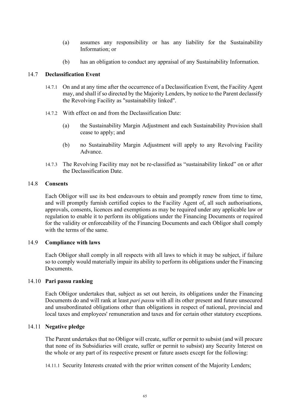 65 (a) assumes any responsibility or has any liability for the Sustainability Information; or (b) has an obligation to conduct any appraisal of any Sustainability Information. 14.7 Declassification Event 14.7.1 On and at any time after the occurrence of a Declassification Event, the Facility Agent may, and shall if so directed by the Majority Lenders, by notice to the Parent declassify the Revolving Facility as "sustainability linked". 14.7.2 With effect on and from the Declassification Date: (a) the Sustainability Margin Adjustment and each Sustainability Provision shall cease to apply; and (b) no Sustainability Margin Adjustment will apply to any Revolving Facility Advance. 14.7.3 The Revolving Facility may not be re-classified as “sustainability linked” on or after the Declassification Date. 14.8 Consents Each Obligor will use its best endeavours to obtain and promptly renew from time to time, and will promptly furnish certified copies to the Facility Agent of, all such authorisations, approvals, consents, licences and exemptions as may be required under any applicable law or regulation to enable it to perform its obligations under the Financing Documents or required for the validity or enforceability of the Financing Documents and each Obligor shall comply with the terms of the same. 14.9 Compliance with laws Each Obligor shall comply in all respects with all laws to which it may be subject, if failure so to comply would materially impair its ability to perform its obligations under the Financing Documents. 14.10 Pari passu ranking Each Obligor undertakes that, subject as set out herein, its obligations under the Financing Documents do and will rank at least pari passu with all its other present and future unsecured and unsubordinated obligations other than obligations in respect of national, provincial and local taxes and employees' remuneration and taxes and for certain other statutory exceptions. 14.11 Negative pledge The Parent undertakes that no Obligor will create, suffer or permit to subsist (and will procure that none of its Subsidiaries will create, suffer or permit to subsist) any Security Interest on the whole or any part of its respective present or future assets except for the following: 14.11.1 Security Interests created with the prior written consent of the Majority Lenders;