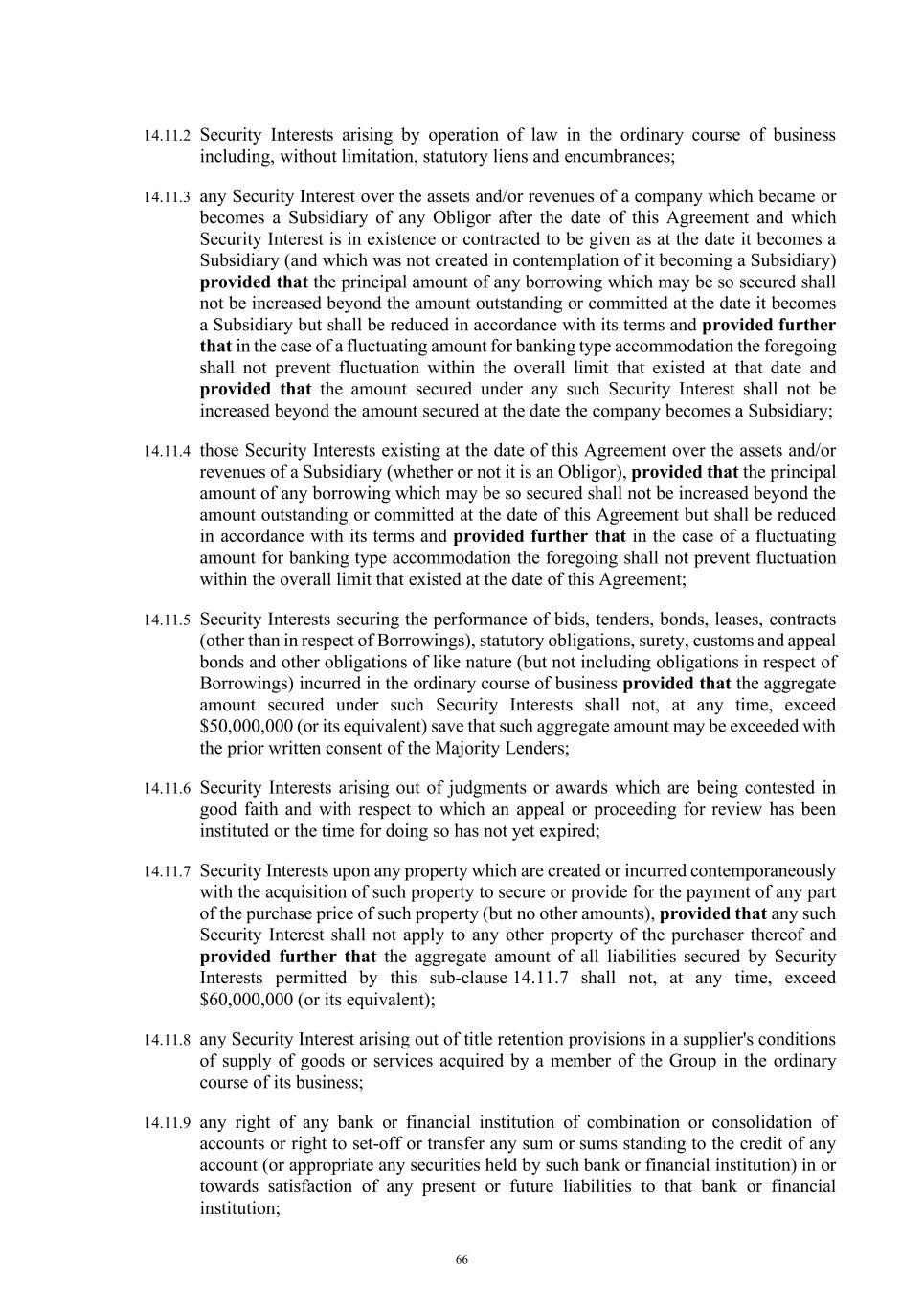 66 14.11.2 Security Interests arising by operation of law in the ordinary course of business including, without limitation, statutory liens and encumbrances; 14.11.3 any Security Interest over the assets and/or revenues of a company which became or becomes a Subsidiary of any Obligor after the date of this Agreement and which Security Interest is in existence or contracted to be given as at the date it becomes a Subsidiary (and which was not created in contemplation of it becoming a Subsidiary) provided that the principal amount of any borrowing which may be so secured shall not be increased beyond the amount outstanding or committed at the date it becomes a Subsidiary but shall be reduced in accordance with its terms and provided further that in the case of a fluctuating amount for banking type accommodation the foregoing shall not prevent fluctuation within the overall limit that existed at that date and provided that the amount secured under any such Security Interest shall not be increased beyond the amount secured at the date the company becomes a Subsidiary; 14.11.4 those Security Interests existing at the date of this Agreement over the assets and/or revenues of a Subsidiary (whether or not it is an Obligor), provided that the principal amount of any borrowing which may be so secured shall not be increased beyond the amount outstanding or committed at the date of this Agreement but shall be reduced in accordance with its terms and provided further that in the case of a fluctuating amount for banking type accommodation the foregoing shall not prevent fluctuation within the overall limit that existed at the date of this Agreement; 14.11.5 Security Interests securing the performance of bids, tenders, bonds, leases, contracts (other than in respect of Borrowings), statutory obligations, surety, customs and appeal bonds and other obligations of like nature (but not including obligations in respect of Borrowings) incurred in the ordinary course of business provided that the aggregate amount secured under such Security Interests shall not, at any time, exceed $50,000,000 (or its equivalent) save that such aggregate amount may be exceeded with the prior written consent of the Majority Lenders; 14.11.6 Security Interests arising out of judgments or awards which are being contested in good faith and with respect to which an appeal or proceeding for review has been instituted or the time for doing so has not yet expired; 14.11.7 Security Interests upon any property which are created or incurred contemporaneously with the acquisition of such property to secure or provide for the payment of any part of the purchase price of such property (but no other amounts), provided that any such Security Interest shall not apply to any other property of the purchaser thereof and provided further that the aggregate amount of all liabilities secured by Security Interests permitted by this sub-clause 14.11.7 shall not, at any time, exceed $60,000,000 (or its equivalent); 14.11.8 any Security Interest arising out of title retention provisions in a supplier's conditions of supply of goods or services acquired by a member of the Group in the ordinary course of its business; 14.11.9 any right of any bank or financial institution of combination or consolidation of accounts or right to set-off or transfer any sum or sums standing to the credit of any account (or appropriate any securities held by such bank or financial institution) in or towards satisfaction of any present or future liabilities to that bank or financial institution;