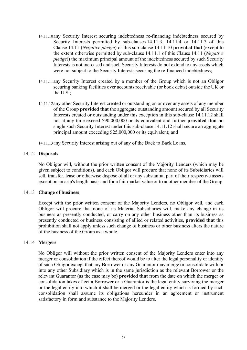67 14.11.10 any Security Interest securing indebtedness re-financing indebtedness secured by Security Interests permitted by sub-clauses 14.11.3, 14.11.4 or 14.11.7 of this Clause 14.11 (Negative pledge) or this sub-clause 14.11.10 provided that (except to the extent otherwise permitted by sub-clause 14.11.1 of this Clause 14.11 (Negative pledge)) the maximum principal amount of the indebtedness secured by such Security Interests is not increased and such Security Interests do not extend to any assets which were not subject to the Security Interests securing the re-financed indebtedness; 14.11.11 any Security Interest created by a member of the Group which is not an Obligor securing banking facilities over accounts receivable (or book debts) outside the UK or the U.S.; 14.11.12 any other Security Interest created or outstanding on or over any assets of any member of the Group provided that the aggregate outstanding amount secured by all Security Interests created or outstanding under this exception in this sub-clause 14.11.12 shall not at any time exceed $90,000,000 or its equivalent and further provided that no single such Security Interest under this sub-clause 14.11.12 shall secure an aggregate principal amount exceeding $25,000,000 or its equivalent; and 14.11.13 any Security Interest arising out of any of the Back to Back Loans. 14.12 Disposals No Obligor will, without the prior written consent of the Majority Lenders (which may be given subject to conditions), and each Obligor will procure that none of its Subsidiaries will sell, transfer, lease or otherwise dispose of all or any substantial part of their respective assets except on an arm's length basis and for a fair market value or to another member of the Group. 14.13 Change of business Except with the prior written consent of the Majority Lenders, no Obligor will, and each Obligor will procure that none of its Material Subsidiaries will, make any change in its business as presently conducted, or carry on any other business other than its business as presently conducted or business consisting of allied or related activities, provided that this prohibition shall not apply unless such change of business or other business alters the nature of the business of the Group as a whole. 14.14 Mergers No Obligor will without the prior written consent of the Majority Lenders enter into any merger or consolidation if the effect thereof would be to alter the legal personality or identity of such Obligor except that any Borrower or any Guarantor may merge or consolidate with or into any other Subsidiary which is in the same jurisdiction as the relevant Borrower or the relevant Guarantor (as the case may be) provided that from the date on which the merger or consolidation takes effect a Borrower or a Guarantor is the legal entity surviving the merger or the legal entity into which it shall be merged or the legal entity which is formed by such consolidation shall assume its obligations hereunder in an agreement or instrument satisfactory in form and substance to the Majority Lenders.