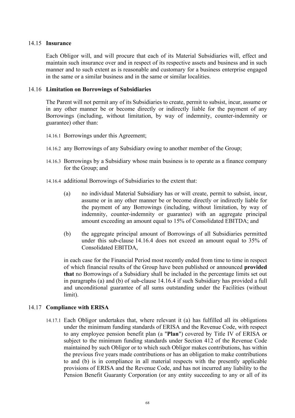 68 14.15 Insurance Each Obligor will, and will procure that each of its Material Subsidiaries will, effect and maintain such insurance over and in respect of its respective assets and business and in such manner and to such extent as is reasonable and customary for a business enterprise engaged in the same or a similar business and in the same or similar localities. 14.16 Limitation on Borrowings of Subsidiaries The Parent will not permit any of its Subsidiaries to create, permit to subsist, incur, assume or in any other manner be or become directly or indirectly liable for the payment of any Borrowings (including, without limitation, by way of indemnity, counter-indemnity or guarantee) other than: 14.16.1 Borrowings under this Agreement; 14.16.2 any Borrowings of any Subsidiary owing to another member of the Group; 14.16.3 Borrowings by a Subsidiary whose main business is to operate as a finance company for the Group; and 14.16.4 additional Borrowings of Subsidiaries to the extent that: (a) no individual Material Subsidiary has or will create, permit to subsist, incur, assume or in any other manner be or become directly or indirectly liable for the payment of any Borrowings (including, without limitation, by way of indemnity, counter-indemnity or guarantee) with an aggregate principal amount exceeding an amount equal to 15% of Consolidated EBITDA; and (b) the aggregate principal amount of Borrowings of all Subsidiaries permitted under this sub-clause 14.16.4 does not exceed an amount equal to 35% of Consolidated EBITDA, in each case for the Financial Period most recently ended from time to time in respect of which financial results of the Group have been published or announced provided that no Borrowings of a Subsidiary shall be included in the percentage limits set out in paragraphs (a) and (b) of sub-clause 14.16.4 if such Subsidiary has provided a full and unconditional guarantee of all sums outstanding under the Facilities (without limit). 14.17 Compliance with ERISA 14.17.1 Each Obligor undertakes that, where relevant it (a) has fulfilled all its obligations under the minimum funding standards of ERISA and the Revenue Code, with respect to any employee pension benefit plan (a "Plan") covered by Title IV of ERISA or subject to the minimum funding standards under Section 412 of the Revenue Code maintained by such Obligor or to which such Obligor makes contributions, has within the previous five years made contributions or has an obligation to make contributions to and (b) is in compliance in all material respects with the presently applicable provisions of ERISA and the Revenue Code, and has not incurred any liability to the Pension Benefit Guaranty Corporation (or any entity succeeding to any or all of its
