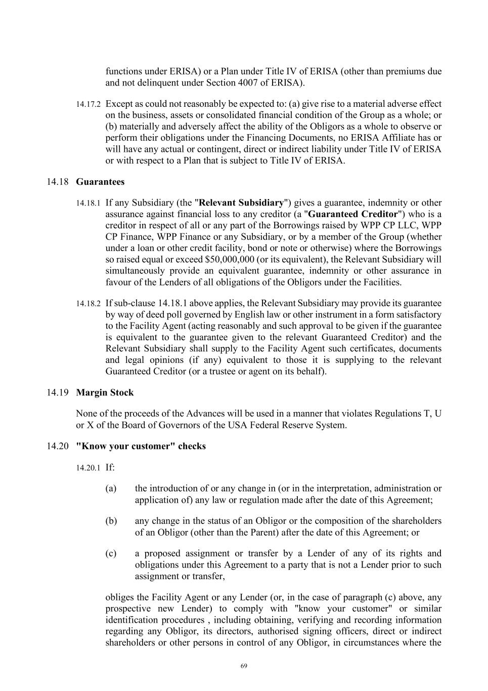 69 functions under ERISA) or a Plan under Title IV of ERISA (other than premiums due and not delinquent under Section 4007 of ERISA). 14.17.2 Except as could not reasonably be expected to: (a) give rise to a material adverse effect on the business, assets or consolidated financial condition of the Group as a whole; or (b) materially and adversely affect the ability of the Obligors as a whole to observe or perform their obligations under the Financing Documents, no ERISA Affiliate has or will have any actual or contingent, direct or indirect liability under Title IV of ERISA or with respect to a Plan that is subject to Title IV of ERISA. 14.18 Guarantees 14.18.1 If any Subsidiary (the "Relevant Subsidiary") gives a guarantee, indemnity or other assurance against financial loss to any creditor (a "Guaranteed Creditor") who is a creditor in respect of all or any part of the Borrowings raised by WPP CP LLC, WPP CP Finance, WPP Finance or any Subsidiary, or by a member of the Group (whether under a loan or other credit facility, bond or note or otherwise) where the Borrowings so raised equal or exceed $50,000,000 (or its equivalent), the Relevant Subsidiary will simultaneously provide an equivalent guarantee, indemnity or other assurance in favour of the Lenders of all obligations of the Obligors under the Facilities. 14.18.2 If sub-clause 14.18.1 above applies, the Relevant Subsidiary may provide its guarantee by way of deed poll governed by English law or other instrument in a form satisfactory to the Facility Agent (acting reasonably and such approval to be given if the guarantee is equivalent to the guarantee given to the relevant Guaranteed Creditor) and the Relevant Subsidiary shall supply to the Facility Agent such certificates, documents and legal opinions (if any) equivalent to those it is supplying to the relevant Guaranteed Creditor (or a trustee or agent on its behalf). 14.19 Margin Stock None of the proceeds of the Advances will be used in a manner that violates Regulations T, U or X of the Board of Governors of the USA Federal Reserve System. 14.20 "Know your customer" checks 14.20.1 If: (a) the introduction of or any change in (or in the interpretation, administration or application of) any law or regulation made after the date of this Agreement; (b) any change in the status of an Obligor or the composition of the shareholders of an Obligor (other than the Parent) after the date of this Agreement; or (c) a proposed assignment or transfer by a Lender of any of its rights and obligations under this Agreement to a party that is not a Lender prior to such assignment or transfer, obliges the Facility Agent or any Lender (or, in the case of paragraph (c) above, any prospective new Lender) to comply with "know your customer" or similar identification procedures , including obtaining, verifying and recording information regarding any Obligor, its directors, authorised signing officers, direct or indirect shareholders or other persons in control of any Obligor, in circumstances where the