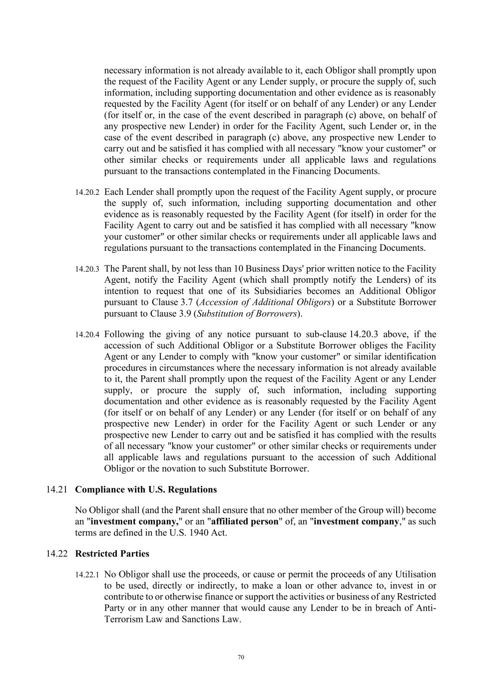 70 necessary information is not already available to it, each Obligor shall promptly upon the request of the Facility Agent or any Lender supply, or procure the supply of, such information, including supporting documentation and other evidence as is reasonably requested by the Facility Agent (for itself or on behalf of any Lender) or any Lender (for itself or, in the case of the event described in paragraph (c) above, on behalf of any prospective new Lender) in order for the Facility Agent, such Lender or, in the case of the event described in paragraph (c) above, any prospective new Lender to carry out and be satisfied it has complied with all necessary "know your customer" or other similar checks or requirements under all applicable laws and regulations pursuant to the transactions contemplated in the Financing Documents. 14.20.2 Each Lender shall promptly upon the request of the Facility Agent supply, or procure the supply of, such information, including supporting documentation and other evidence as is reasonably requested by the Facility Agent (for itself) in order for the Facility Agent to carry out and be satisfied it has complied with all necessary "know your customer" or other similar checks or requirements under all applicable laws and regulations pursuant to the transactions contemplated in the Financing Documents. 14.20.3 The Parent shall, by not less than 10 Business Days' prior written notice to the Facility Agent, notify the Facility Agent (which shall promptly notify the Lenders) of its intention to request that one of its Subsidiaries becomes an Additional Obligor pursuant to Clause 3.7 (Accession of Additional Obligors) or a Substitute Borrower pursuant to Clause 3.9 (Substitution of Borrowers). 14.20.4 Following the giving of any notice pursuant to sub-clause 14.20.3 above, if the accession of such Additional Obligor or a Substitute Borrower obliges the Facility Agent or any Lender to comply with "know your customer" or similar identification procedures in circumstances where the necessary information is not already available to it, the Parent shall promptly upon the request of the Facility Agent or any Lender supply, or procure the supply of, such information, including supporting documentation and other evidence as is reasonably requested by the Facility Agent (for itself or on behalf of any Lender) or any Lender (for itself or on behalf of any prospective new Lender) in order for the Facility Agent or such Lender or any prospective new Lender to carry out and be satisfied it has complied with the results of all necessary "know your customer" or other similar checks or requirements under all applicable laws and regulations pursuant to the accession of such Additional Obligor or the novation to such Substitute Borrower. 14.21 Compliance with U.S. Regulations No Obligor shall (and the Parent shall ensure that no other member of the Group will) become an "investment company," or an "affiliated person" of, an "investment company," as such terms are defined in the U.S. 1940 Act. 14.22 Restricted Parties 14.22.1 No Obligor shall use the proceeds, or cause or permit the proceeds of any Utilisation to be used, directly or indirectly, to make a loan or other advance to, invest in or contribute to or otherwise finance or support the activities or business of any Restricted Party or in any other manner that would cause any Lender to be in breach of Anti- Terrorism Law and Sanctions Law.