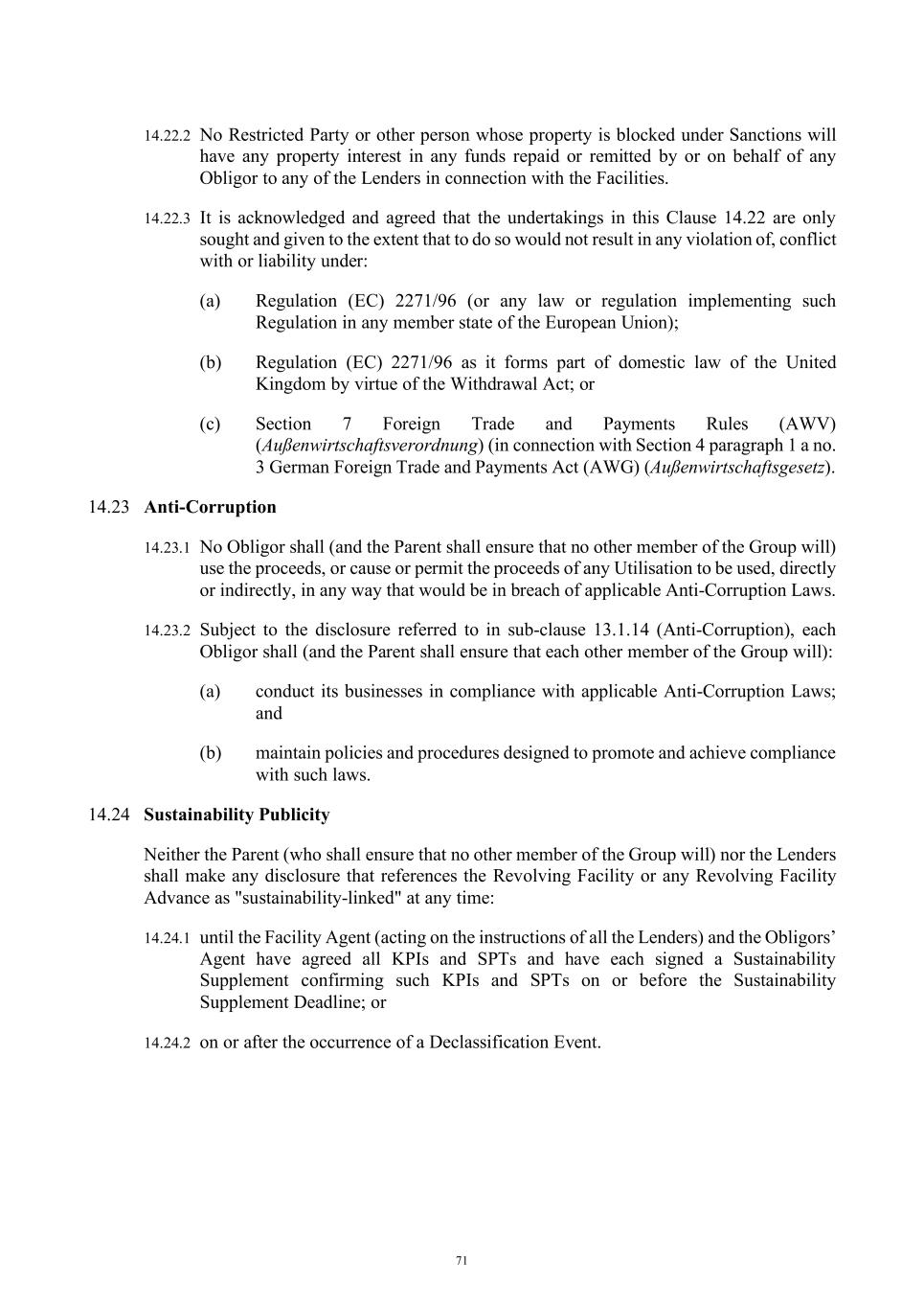 71 14.22.2 No Restricted Party or other person whose property is blocked under Sanctions will have any property interest in any funds repaid or remitted by or on behalf of any Obligor to any of the Lenders in connection with the Facilities. 14.22.3 It is acknowledged and agreed that the undertakings in this Clause 14.22 are only sought and given to the extent that to do so would not result in any violation of, conflict with or liability under: (a) Regulation (EC) 2271/96 (or any law or regulation implementing such Regulation in any member state of the European Union); (b) Regulation (EC) 2271/96 as it forms part of domestic law of the United Kingdom by virtue of the Withdrawal Act; or (c) Section 7 Foreign Trade and Payments Rules (AWV) (Außenwirtschaftsverordnung) (in connection with Section 4 paragraph 1 a no. 3 German Foreign Trade and Payments Act (AWG) (Außenwirtschaftsgesetz). 14.23 Anti-Corruption 14.23.1 No Obligor shall (and the Parent shall ensure that no other member of the Group will) use the proceeds, or cause or permit the proceeds of any Utilisation to be used, directly or indirectly, in any way that would be in breach of applicable Anti-Corruption Laws. 14.23.2 Subject to the disclosure referred to in sub-clause 13.1.14 (Anti-Corruption), each Obligor shall (and the Parent shall ensure that each other member of the Group will): (a) conduct its businesses in compliance with applicable Anti-Corruption Laws; and (b) maintain policies and procedures designed to promote and achieve compliance with such laws. 14.24 Sustainability Publicity Neither the Parent (who shall ensure that no other member of the Group will) nor the Lenders shall make any disclosure that references the Revolving Facility or any Revolving Facility Advance as "sustainability-linked" at any time: 14.24.1 until the Facility Agent (acting on the instructions of all the Lenders) and the Obligors’ Agent have agreed all KPIs and SPTs and have each signed a Sustainability Supplement confirming such KPIs and SPTs on or before the Sustainability Supplement Deadline; or 14.24.2 on or after the occurrence of a Declassification Event.