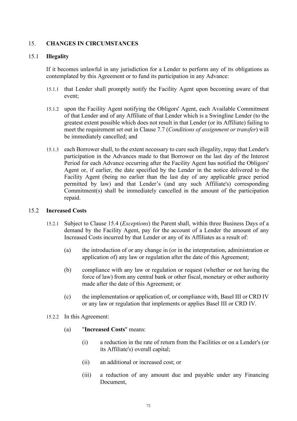 72 15. CHANGES IN CIRCUMSTANCES 15.1 Illegality If it becomes unlawful in any jurisdiction for a Lender to perform any of its obligations as contemplated by this Agreement or to fund its participation in any Advance: 15.1.1 that Lender shall promptly notify the Facility Agent upon becoming aware of that event; 15.1.2 upon the Facility Agent notifying the Obligors' Agent, each Available Commitment of that Lender and of any Affiliate of that Lender which is a Swingline Lender (to the greatest extent possible which does not result in that Lender (or its Affiliate) failing to meet the requirement set out in Clause 7.7 (Conditions of assignment or transfer) will be immediately cancelled; and 15.1.3 each Borrower shall, to the extent necessary to cure such illegality, repay that Lender's participation in the Advances made to that Borrower on the last day of the Interest Period for each Advance occurring after the Facility Agent has notified the Obligors' Agent or, if earlier, the date specified by the Lender in the notice delivered to the Facility Agent (being no earlier than the last day of any applicable grace period permitted by law) and that Lender’s (and any such Affiliate's) corresponding Commitment(s) shall be immediately cancelled in the amount of the participation repaid. 15.2 Increased Costs 15.2.1 Subject to Clause 15.4 (Exceptions) the Parent shall, within three Business Days of a demand by the Facility Agent, pay for the account of a Lender the amount of any Increased Costs incurred by that Lender or any of its Affiliates as a result of: (a) the introduction of or any change in (or in the interpretation, administration or application of) any law or regulation after the date of this Agreement; (b) compliance with any law or regulation or request (whether or not having the force of law) from any central bank or other fiscal, monetary or other authority made after the date of this Agreement; or (c) the implementation or application of, or compliance with, Basel III or CRD IV or any law or regulation that implements or applies Basel III or CRD IV. 15.2.2 In this Agreement: (a) "Increased Costs" means: (i) a reduction in the rate of return from the Facilities or on a Lender's (or its Affiliate's) overall capital; (ii) an additional or increased cost; or (iii) a reduction of any amount due and payable under any Financing Document,