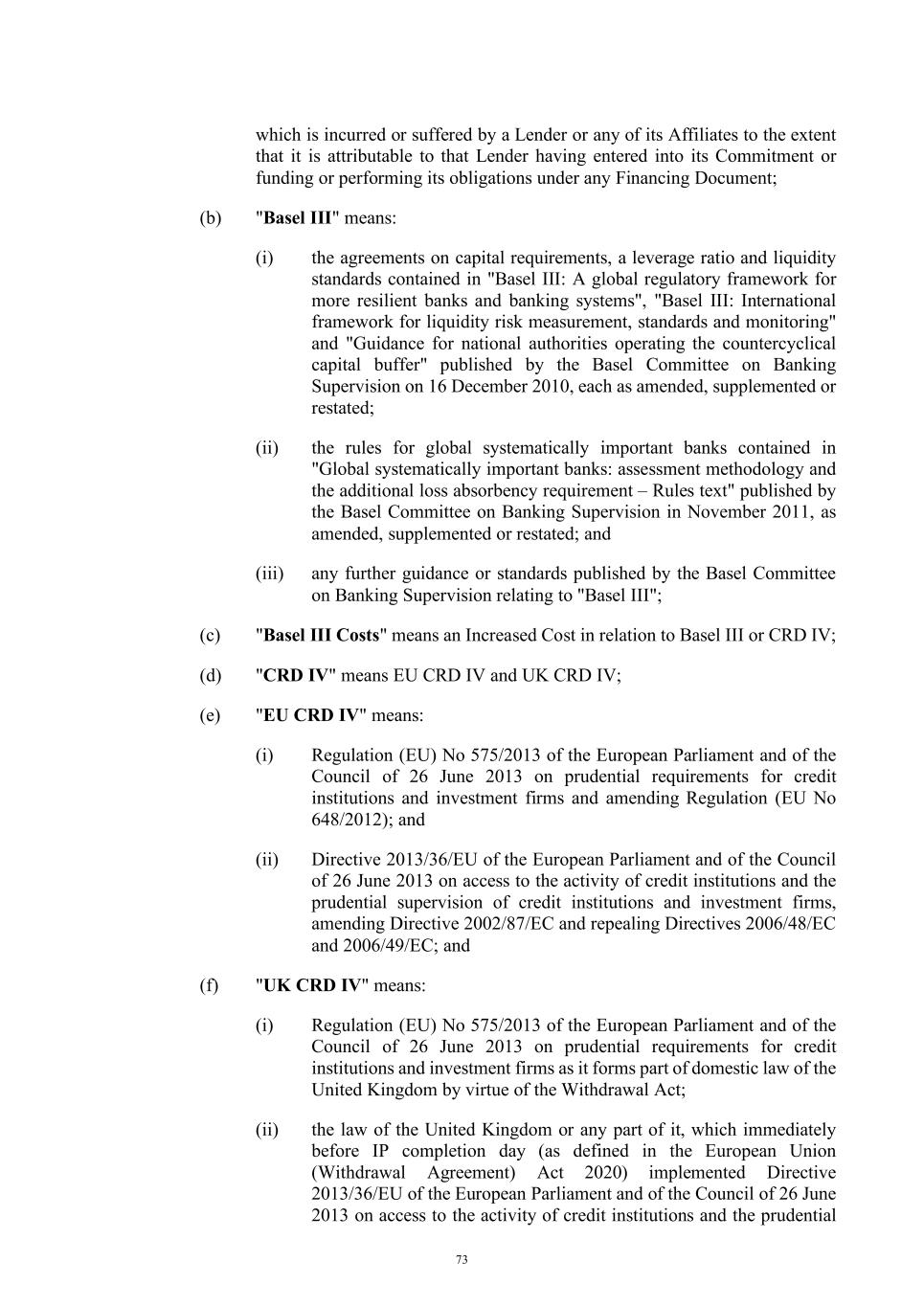 73 which is incurred or suffered by a Lender or any of its Affiliates to the extent that it is attributable to that Lender having entered into its Commitment or funding or performing its obligations under any Financing Document; (b) "Basel III" means: (i) the agreements on capital requirements, a leverage ratio and liquidity standards contained in "Basel III: A global regulatory framework for more resilient banks and banking systems", "Basel III: International framework for liquidity risk measurement, standards and monitoring" and "Guidance for national authorities operating the countercyclical capital buffer" published by the Basel Committee on Banking Supervision on 16 December 2010, each as amended, supplemented or restated; (ii) the rules for global systematically important banks contained in "Global systematically important banks: assessment methodology and the additional loss absorbency requirement – Rules text" published by the Basel Committee on Banking Supervision in November 2011, as amended, supplemented or restated; and (iii) any further guidance or standards published by the Basel Committee on Banking Supervision relating to "Basel III"; (c) "Basel III Costs" means an Increased Cost in relation to Basel III or CRD IV; (d) "CRD IV" means EU CRD IV and UK CRD IV; (e) "EU CRD IV" means: (i) Regulation (EU) No 575/2013 of the European Parliament and of the Council of 26 June 2013 on prudential requirements for credit institutions and investment firms and amending Regulation (EU No 648/2012); and (ii) Directive 2013/36/EU of the European Parliament and of the Council of 26 June 2013 on access to the activity of credit institutions and the prudential supervision of credit institutions and investment firms, amending Directive 2002/87/EC and repealing Directives 2006/48/EC and 2006/49/EC; and (f) "UK CRD IV" means: (i) Regulation (EU) No 575/2013 of the European Parliament and of the Council of 26 June 2013 on prudential requirements for credit institutions and investment firms as it forms part of domestic law of the United Kingdom by virtue of the Withdrawal Act; (ii) the law of the United Kingdom or any part of it, which immediately before IP completion day (as defined in the European Union (Withdrawal Agreement) Act 2020) implemented Directive 2013/36/EU of the European Parliament and of the Council of 26 June 2013 on access to the activity of credit institutions and the prudential