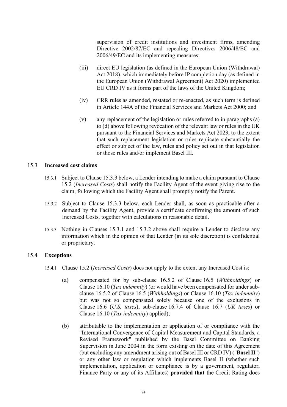 74 supervision of credit institutions and investment firms, amending Directive 2002/87/EC and repealing Directives 2006/48/EC and 2006/49/EC and its implementing measures; (iii) direct EU legislation (as defined in the European Union (Withdrawal) Act 2018), which immediately before IP completion day (as defined in the European Union (Withdrawal Agreement) Act 2020) implemented EU CRD IV as it forms part of the laws of the United Kingdom; (iv) CRR rules as amended, restated or re-enacted, as such term is defined in Article 144A of the Financial Services and Markets Act 2000; and (v) any replacement of the legislation or rules referred to in paragraphs (a) to (d) above following revocation of the relevant law or rules in the UK pursuant to the Financial Services and Markets Act 2023, to the extent that such replacement legislation or rules replicate substantially the effect or subject of the law, rules and policy set out in that legislation or those rules and/or implement Basel III. 15.3 Increased cost claims 15.3.1 Subject to Clause 15.3.3 below, a Lender intending to make a claim pursuant to Clause 15.2 (Increased Costs) shall notify the Facility Agent of the event giving rise to the claim, following which the Facility Agent shall promptly notify the Parent. 15.3.2 Subject to Clause 15.3.3 below, each Lender shall, as soon as practicable after a demand by the Facility Agent, provide a certificate confirming the amount of such Increased Costs, together with calculations in reasonable detail. 15.3.3 Nothing in Clauses 15.3.1 and 15.3.2 above shall require a Lender to disclose any information which in the opinion of that Lender (in its sole discretion) is confidential or proprietary. 15.4 Exceptions 15.4.1 Clause 15.2 (Increased Costs) does not apply to the extent any Increased Cost is: (a) compensated for by sub-clause 16.5.2 of Clause 16.5 (Withholdings) or Clause 16.10 (Tax indemnity) (or would have been compensated for under sub- clause 16.5.2 of Clause 16.5 (Withholdings) or Clause 16.10 (Tax indemnity) but was not so compensated solely because one of the exclusions in Clause 16.6 (U.S. taxes), sub-clause 16.7.4 of Clause 16.7 (UK taxes) or Clause 16.10 (Tax indemnity) applied); (b) attributable to the implementation or application of or compliance with the "International Convergence of Capital Measurement and Capital Standards, a Revised Framework" published by the Basel Committee on Banking Supervision in June 2004 in the form existing on the date of this Agreement (but excluding any amendment arising out of Basel III or CRD IV) ("Basel II") or any other law or regulation which implements Basel II (whether such implementation, application or compliance is by a government, regulator, Finance Party or any of its Affiliates) provided that the Credit Rating does