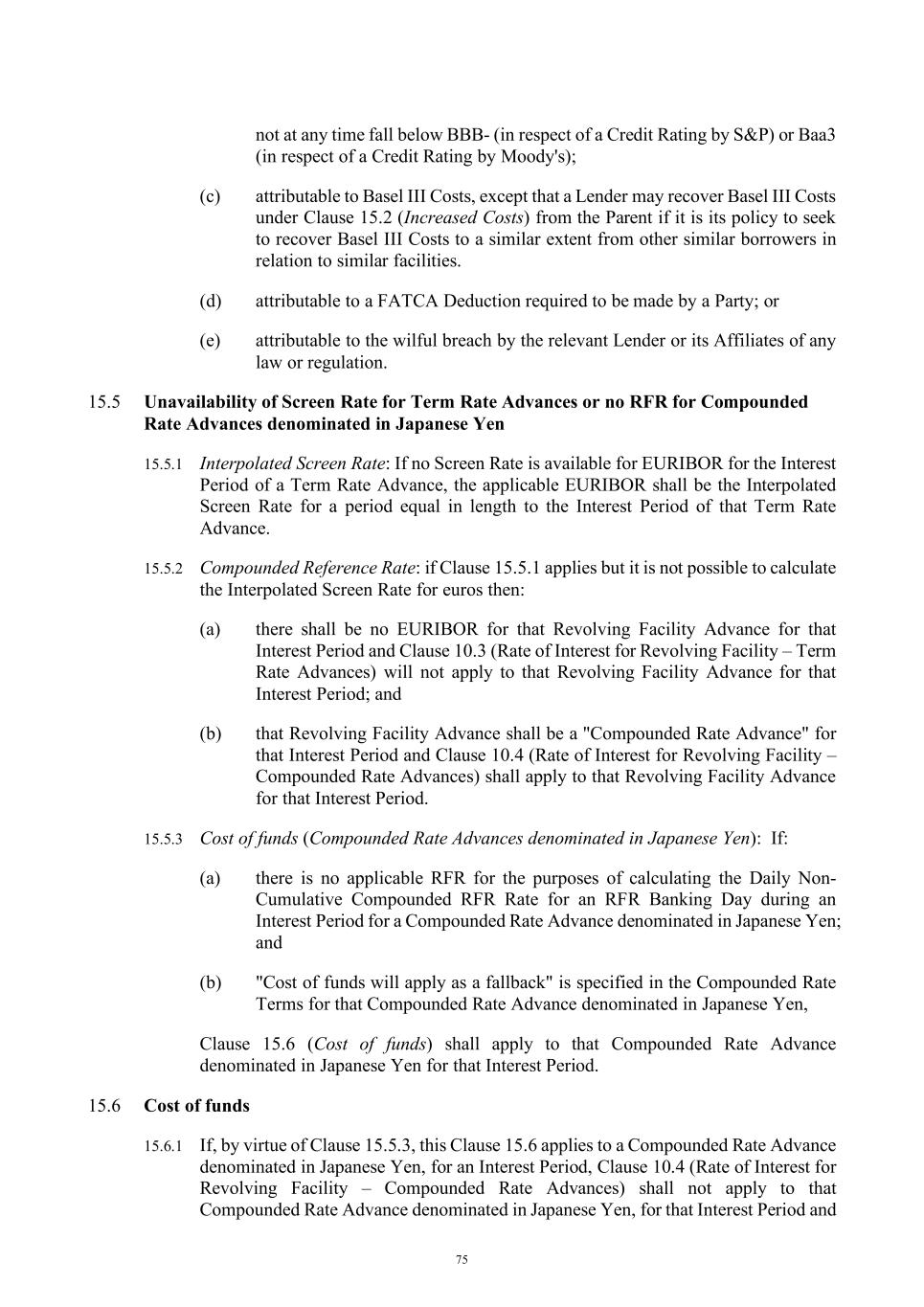 75 not at any time fall below BBB- (in respect of a Credit Rating by S&P) or Baa3 (in respect of a Credit Rating by Moody's); (c) attributable to Basel III Costs, except that a Lender may recover Basel III Costs under Clause 15.2 (Increased Costs) from the Parent if it is its policy to seek to recover Basel III Costs to a similar extent from other similar borrowers in relation to similar facilities. (d) attributable to a FATCA Deduction required to be made by a Party; or (e) attributable to the wilful breach by the relevant Lender or its Affiliates of any law or regulation. 15.5 Unavailability of Screen Rate for Term Rate Advances or no RFR for Compounded Rate Advances denominated in Japanese Yen 15.5.1 Interpolated Screen Rate: If no Screen Rate is available for EURIBOR for the Interest Period of a Term Rate Advance, the applicable EURIBOR shall be the Interpolated Screen Rate for a period equal in length to the Interest Period of that Term Rate Advance. 15.5.2 Compounded Reference Rate: if Clause 15.5.1 applies but it is not possible to calculate the Interpolated Screen Rate for euros then: (a) there shall be no EURIBOR for that Revolving Facility Advance for that Interest Period and Clause 10.3 (Rate of Interest for Revolving Facility – Term Rate Advances) will not apply to that Revolving Facility Advance for that Interest Period; and (b) that Revolving Facility Advance shall be a "Compounded Rate Advance" for that Interest Period and Clause 10.4 (Rate of Interest for Revolving Facility – Compounded Rate Advances) shall apply to that Revolving Facility Advance for that Interest Period. 15.5.3 Cost of funds (Compounded Rate Advances denominated in Japanese Yen): If: (a) there is no applicable RFR for the purposes of calculating the Daily Non- Cumulative Compounded RFR Rate for an RFR Banking Day during an Interest Period for a Compounded Rate Advance denominated in Japanese Yen; and (b) "Cost of funds will apply as a fallback" is specified in the Compounded Rate Terms for that Compounded Rate Advance denominated in Japanese Yen, Clause 15.6 (Cost of funds) shall apply to that Compounded Rate Advance denominated in Japanese Yen for that Interest Period. 15.6 Cost of funds 15.6.1 If, by virtue of Clause 15.5.3, this Clause 15.6 applies to a Compounded Rate Advance denominated in Japanese Yen, for an Interest Period, Clause 10.4 (Rate of Interest for Revolving Facility – Compounded Rate Advances) shall not apply to that Compounded Rate Advance denominated in Japanese Yen, for that Interest Period and