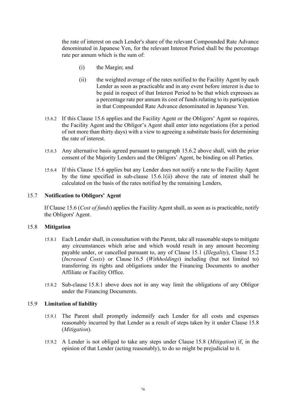 76 the rate of interest on each Lender's share of the relevant Compounded Rate Advance denominated in Japanese Yen, for the relevant Interest Period shall be the percentage rate per annum which is the sum of: (i) the Margin; and (ii) the weighted average of the rates notified to the Facility Agent by each Lender as soon as practicable and in any event before interest is due to be paid in respect of that Interest Period to be that which expresses as a percentage rate per annum its cost of funds relating to its participation in that Compounded Rate Advance denominated in Japanese Yen. 15.6.2 If this Clause 15.6 applies and the Facility Agent or the Obligors’ Agent so requires, the Facility Agent and the Obligor’s Agent shall enter into negotiations (for a period of not more than thirty days) with a view to agreeing a substitute basis for determining the rate of interest. 15.6.3 Any alternative basis agreed pursuant to paragraph 15.6.2 above shall, with the prior consent of the Majority Lenders and the Obligors’ Agent, be binding on all Parties. 15.6.4 If this Clause 15.6 applies but any Lender does not notify a rate to the Facility Agent by the time specified in sub-clause 15.6.1(ii) above the rate of interest shall be calculated on the basis of the rates notified by the remaining Lenders. 15.7 Notification to Obligors’ Agent If Clause 15.6 (Cost of funds) applies the Facility Agent shall, as soon as is practicable, notify the Obligors' Agent. 15.8 Mitigation 15.8.1 Each Lender shall, in consultation with the Parent, take all reasonable steps to mitigate any circumstances which arise and which would result in any amount becoming payable under, or cancelled pursuant to, any of Clause 15.1 (Illegality), Clause 15.2 (Increased Costs) or Clause 16.5 (Withholdings) including (but not limited to) transferring its rights and obligations under the Financing Documents to another Affiliate or Facility Office. 15.8.2 Sub-clause 15.8.1 above does not in any way limit the obligations of any Obligor under the Financing Documents. 15.9 Limitation of liability 15.9.1 The Parent shall promptly indemnify each Lender for all costs and expenses reasonably incurred by that Lender as a result of steps taken by it under Clause 15.8 (Mitigation). 15.9.2 A Lender is not obliged to take any steps under Clause 15.8 (Mitigation) if, in the opinion of that Lender (acting reasonably), to do so might be prejudicial to it.