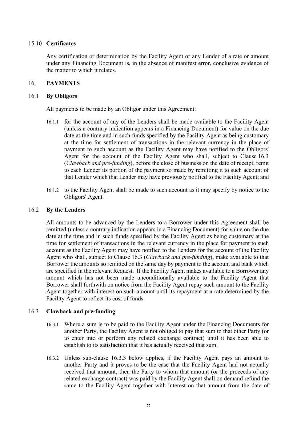 77 15.10 Certificates Any certification or determination by the Facility Agent or any Lender of a rate or amount under any Financing Document is, in the absence of manifest error, conclusive evidence of the matter to which it relates. 16. PAYMENTS 16.1 By Obligors All payments to be made by an Obligor under this Agreement: 16.1.1 for the account of any of the Lenders shall be made available to the Facility Agent (unless a contrary indication appears in a Financing Document) for value on the due date at the time and in such funds specified by the Facility Agent as being customary at the time for settlement of transactions in the relevant currency in the place of payment to such account as the Facility Agent may have notified to the Obligors' Agent for the account of the Facility Agent who shall, subject to Clause 16.3 (Clawback and pre-funding), before the close of business on the date of receipt, remit to each Lender its portion of the payment so made by remitting it to such account of that Lender which that Lender may have previously notified to the Facility Agent; and 16.1.2 to the Facility Agent shall be made to such account as it may specify by notice to the Obligors' Agent. 16.2 By the Lenders All amounts to be advanced by the Lenders to a Borrower under this Agreement shall be remitted (unless a contrary indication appears in a Financing Document) for value on the due date at the time and in such funds specified by the Facility Agent as being customary at the time for settlement of transactions in the relevant currency in the place for payment to such account as the Facility Agent may have notified to the Lenders for the account of the Facility Agent who shall, subject to Clause 16.3 (Clawback and pre-funding), make available to that Borrower the amounts so remitted on the same day by payment to the account and bank which are specified in the relevant Request. If the Facility Agent makes available to a Borrower any amount which has not been made unconditionally available to the Facility Agent that Borrower shall forthwith on notice from the Facility Agent repay such amount to the Facility Agent together with interest on such amount until its repayment at a rate determined by the Facility Agent to reflect its cost of funds. 16.3 Clawback and pre-funding 16.3.1 Where a sum is to be paid to the Facility Agent under the Financing Documents for another Party, the Facility Agent is not obliged to pay that sum to that other Party (or to enter into or perform any related exchange contract) until it has been able to establish to its satisfaction that it has actually received that sum. 16.3.2 Unless sub-clause 16.3.3 below applies, if the Facility Agent pays an amount to another Party and it proves to be the case that the Facility Agent had not actually received that amount, then the Party to whom that amount (or the proceeds of any related exchange contract) was paid by the Facility Agent shall on demand refund the same to the Facility Agent together with interest on that amount from the date of
