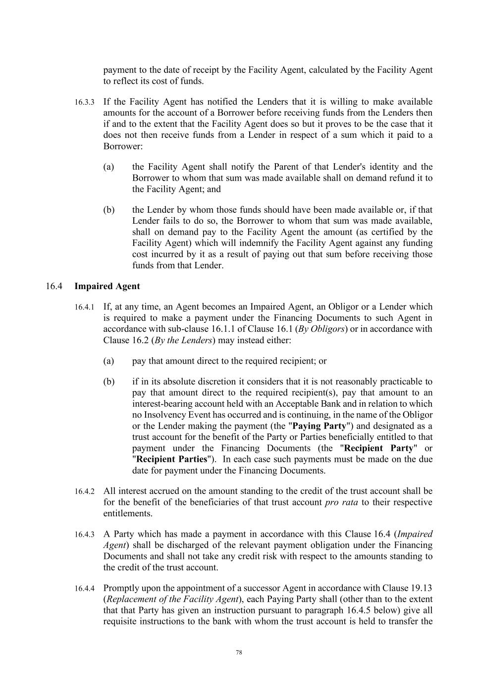 78 payment to the date of receipt by the Facility Agent, calculated by the Facility Agent to reflect its cost of funds. 16.3.3 If the Facility Agent has notified the Lenders that it is willing to make available amounts for the account of a Borrower before receiving funds from the Lenders then if and to the extent that the Facility Agent does so but it proves to be the case that it does not then receive funds from a Lender in respect of a sum which it paid to a Borrower: (a) the Facility Agent shall notify the Parent of that Lender's identity and the Borrower to whom that sum was made available shall on demand refund it to the Facility Agent; and (b) the Lender by whom those funds should have been made available or, if that Lender fails to do so, the Borrower to whom that sum was made available, shall on demand pay to the Facility Agent the amount (as certified by the Facility Agent) which will indemnify the Facility Agent against any funding cost incurred by it as a result of paying out that sum before receiving those funds from that Lender. 16.4 Impaired Agent 16.4.1 If, at any time, an Agent becomes an Impaired Agent, an Obligor or a Lender which is required to make a payment under the Financing Documents to such Agent in accordance with sub-clause 16.1.1 of Clause 16.1 (By Obligors) or in accordance with Clause 16.2 (By the Lenders) may instead either: (a) pay that amount direct to the required recipient; or (b) if in its absolute discretion it considers that it is not reasonably practicable to pay that amount direct to the required recipient(s), pay that amount to an interest-bearing account held with an Acceptable Bank and in relation to which no Insolvency Event has occurred and is continuing, in the name of the Obligor or the Lender making the payment (the "Paying Party") and designated as a trust account for the benefit of the Party or Parties beneficially entitled to that payment under the Financing Documents (the "Recipient Party" or "Recipient Parties"). In each case such payments must be made on the due date for payment under the Financing Documents. 16.4.2 All interest accrued on the amount standing to the credit of the trust account shall be for the benefit of the beneficiaries of that trust account pro rata to their respective entitlements. 16.4.3 A Party which has made a payment in accordance with this Clause 16.4 (Impaired Agent) shall be discharged of the relevant payment obligation under the Financing Documents and shall not take any credit risk with respect to the amounts standing to the credit of the trust account. 16.4.4 Promptly upon the appointment of a successor Agent in accordance with Clause 19.13 (Replacement of the Facility Agent), each Paying Party shall (other than to the extent that that Party has given an instruction pursuant to paragraph 16.4.5 below) give all requisite instructions to the bank with whom the trust account is held to transfer the