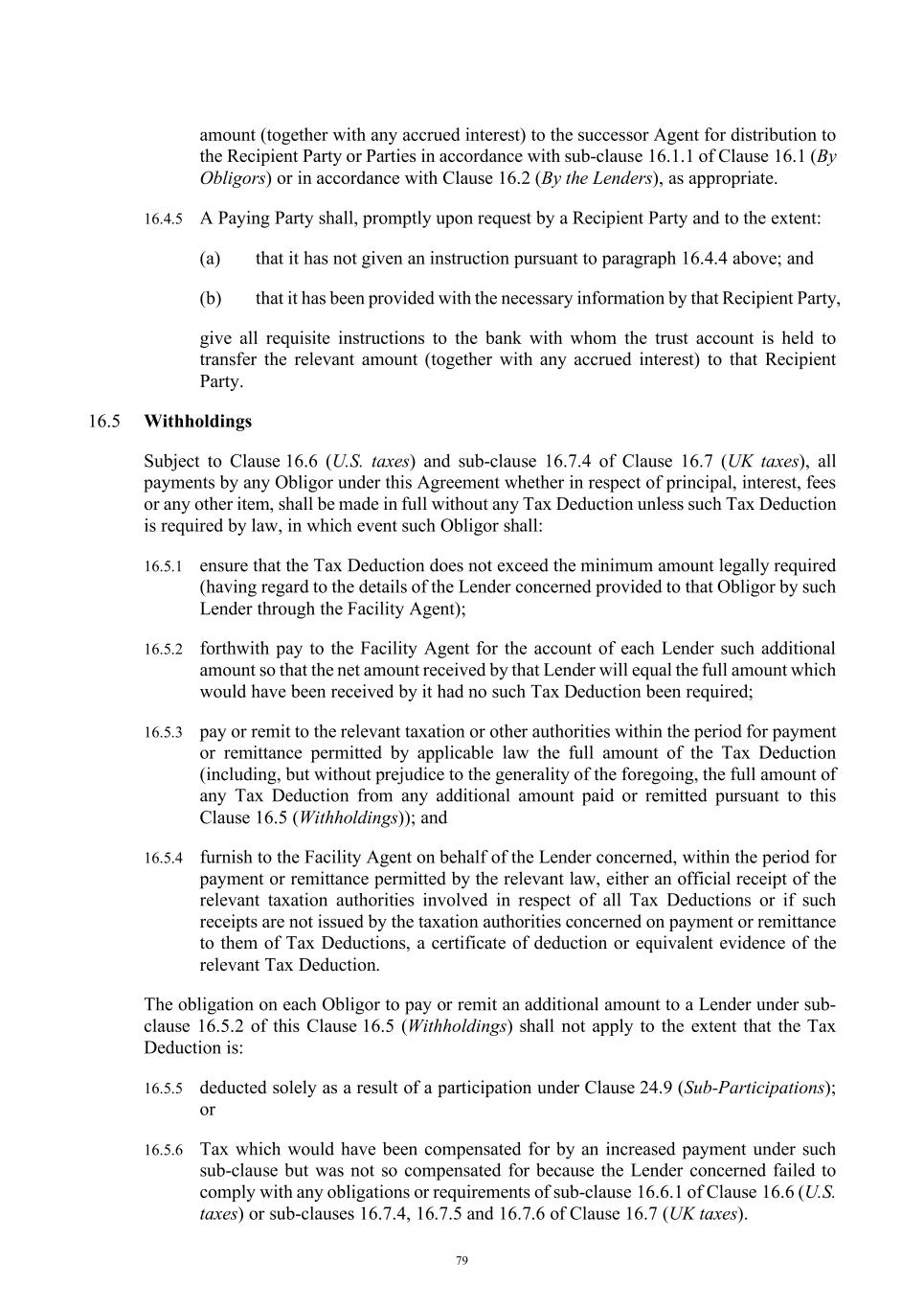 79 amount (together with any accrued interest) to the successor Agent for distribution to the Recipient Party or Parties in accordance with sub-clause 16.1.1 of Clause 16.1 (By Obligors) or in accordance with Clause 16.2 (By the Lenders), as appropriate. 16.4.5 A Paying Party shall, promptly upon request by a Recipient Party and to the extent: (a) that it has not given an instruction pursuant to paragraph 16.4.4 above; and (b) that it has been provided with the necessary information by that Recipient Party, give all requisite instructions to the bank with whom the trust account is held to transfer the relevant amount (together with any accrued interest) to that Recipient Party. 16.5 Withholdings Subject to Clause 16.6 (U.S. taxes) and sub-clause 16.7.4 of Clause 16.7 (UK taxes), all payments by any Obligor under this Agreement whether in respect of principal, interest, fees or any other item, shall be made in full without any Tax Deduction unless such Tax Deduction is required by law, in which event such Obligor shall: 16.5.1 ensure that the Tax Deduction does not exceed the minimum amount legally required (having regard to the details of the Lender concerned provided to that Obligor by such Lender through the Facility Agent); 16.5.2 forthwith pay to the Facility Agent for the account of each Lender such additional amount so that the net amount received by that Lender will equal the full amount which would have been received by it had no such Tax Deduction been required; 16.5.3 pay or remit to the relevant taxation or other authorities within the period for payment or remittance permitted by applicable law the full amount of the Tax Deduction (including, but without prejudice to the generality of the foregoing, the full amount of any Tax Deduction from any additional amount paid or remitted pursuant to this Clause 16.5 (Withholdings)); and 16.5.4 furnish to the Facility Agent on behalf of the Lender concerned, within the period for payment or remittance permitted by the relevant law, either an official receipt of the relevant taxation authorities involved in respect of all Tax Deductions or if such receipts are not issued by the taxation authorities concerned on payment or remittance to them of Tax Deductions, a certificate of deduction or equivalent evidence of the relevant Tax Deduction. The obligation on each Obligor to pay or remit an additional amount to a Lender under sub- clause 16.5.2 of this Clause 16.5 (Withholdings) shall not apply to the extent that the Tax Deduction is: 16.5.5 deducted solely as a result of a participation under Clause 24.9 (Sub-Participations); or 16.5.6 Tax which would have been compensated for by an increased payment under such sub-clause but was not so compensated for because the Lender concerned failed to comply with any obligations or requirements of sub-clause 16.6.1 of Clause 16.6 (U.S. taxes) or sub-clauses 16.7.4, 16.7.5 and 16.7.6 of Clause 16.7 (UK taxes).