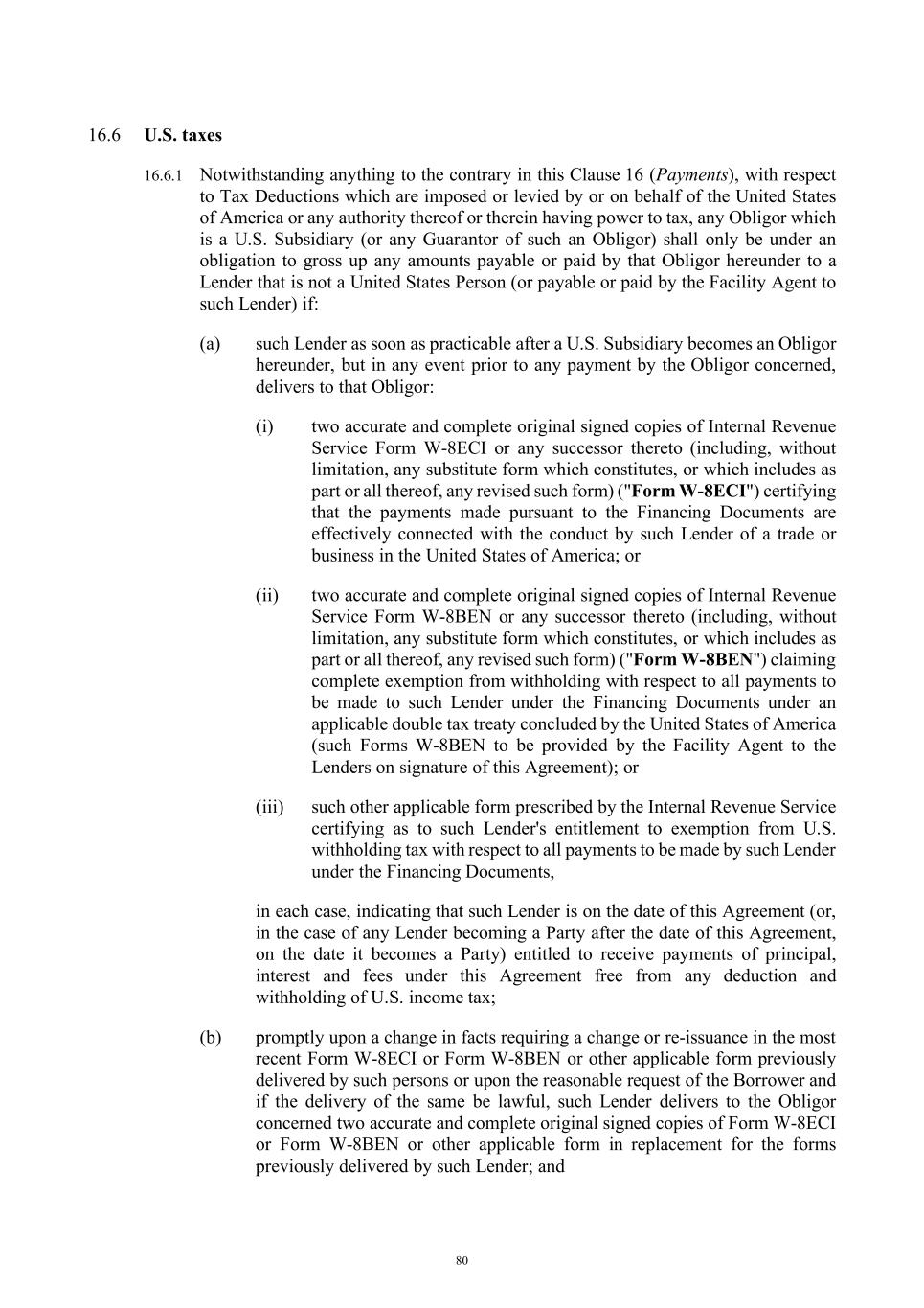 80 16.6 U.S. taxes 16.6.1 Notwithstanding anything to the contrary in this Clause 16 (Payments), with respect to Tax Deductions which are imposed or levied by or on behalf of the United States of America or any authority thereof or therein having power to tax, any Obligor which is a U.S. Subsidiary (or any Guarantor of such an Obligor) shall only be under an obligation to gross up any amounts payable or paid by that Obligor hereunder to a Lender that is not a United States Person (or payable or paid by the Facility Agent to such Lender) if: (a) such Lender as soon as practicable after a U.S. Subsidiary becomes an Obligor hereunder, but in any event prior to any payment by the Obligor concerned, delivers to that Obligor: (i) two accurate and complete original signed copies of Internal Revenue Service Form W-8ECI or any successor thereto (including, without limitation, any substitute form which constitutes, or which includes as part or all thereof, any revised such form) ("Form W-8ECI") certifying that the payments made pursuant to the Financing Documents are effectively connected with the conduct by such Lender of a trade or business in the United States of America; or (ii) two accurate and complete original signed copies of Internal Revenue Service Form W-8BEN or any successor thereto (including, without limitation, any substitute form which constitutes, or which includes as part or all thereof, any revised such form) ("Form W-8BEN") claiming complete exemption from withholding with respect to all payments to be made to such Lender under the Financing Documents under an applicable double tax treaty concluded by the United States of America (such Forms W-8BEN to be provided by the Facility Agent to the Lenders on signature of this Agreement); or (iii) such other applicable form prescribed by the Internal Revenue Service certifying as to such Lender's entitlement to exemption from U.S. withholding tax with respect to all payments to be made by such Lender under the Financing Documents, in each case, indicating that such Lender is on the date of this Agreement (or, in the case of any Lender becoming a Party after the date of this Agreement, on the date it becomes a Party) entitled to receive payments of principal, interest and fees under this Agreement free from any deduction and withholding of U.S. income tax; (b) promptly upon a change in facts requiring a change or re-issuance in the most recent Form W-8ECI or Form W-8BEN or other applicable form previously delivered by such persons or upon the reasonable request of the Borrower and if the delivery of the same be lawful, such Lender delivers to the Obligor concerned two accurate and complete original signed copies of Form W-8ECI or Form W-8BEN or other applicable form in replacement for the forms previously delivered by such Lender; and