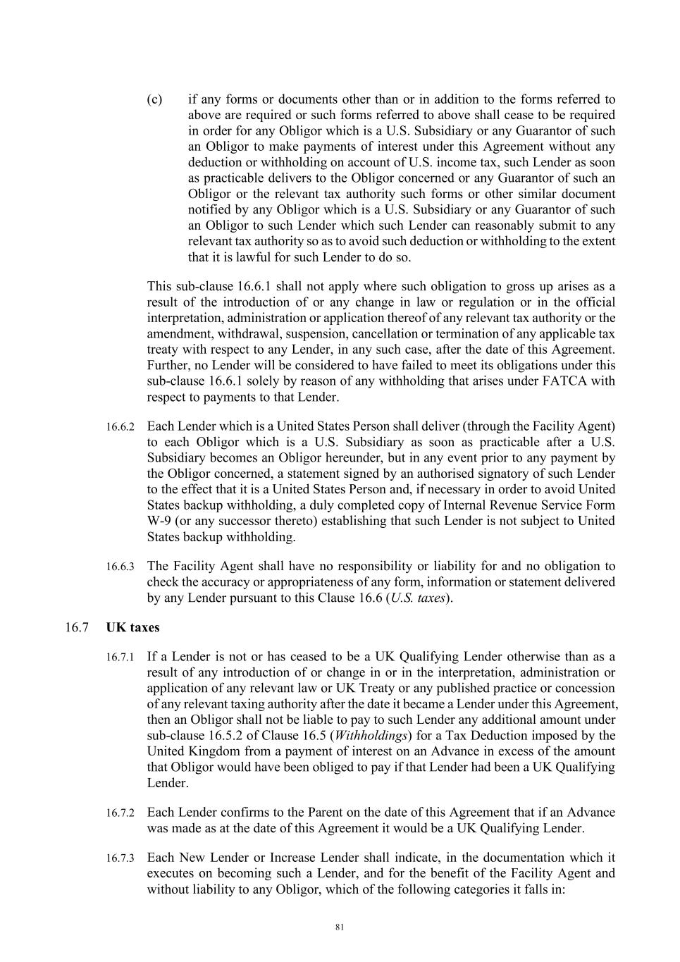 81 (c) if any forms or documents other than or in addition to the forms referred to above are required or such forms referred to above shall cease to be required in order for any Obligor which is a U.S. Subsidiary or any Guarantor of such an Obligor to make payments of interest under this Agreement without any deduction or withholding on account of U.S. income tax, such Lender as soon as practicable delivers to the Obligor concerned or any Guarantor of such an Obligor or the relevant tax authority such forms or other similar document notified by any Obligor which is a U.S. Subsidiary or any Guarantor of such an Obligor to such Lender which such Lender can reasonably submit to any relevant tax authority so as to avoid such deduction or withholding to the extent that it is lawful for such Lender to do so. This sub-clause 16.6.1 shall not apply where such obligation to gross up arises as a result of the introduction of or any change in law or regulation or in the official interpretation, administration or application thereof of any relevant tax authority or the amendment, withdrawal, suspension, cancellation or termination of any applicable tax treaty with respect to any Lender, in any such case, after the date of this Agreement. Further, no Lender will be considered to have failed to meet its obligations under this sub-clause 16.6.1 solely by reason of any withholding that arises under FATCA with respect to payments to that Lender. 16.6.2 Each Lender which is a United States Person shall deliver (through the Facility Agent) to each Obligor which is a U.S. Subsidiary as soon as practicable after a U.S. Subsidiary becomes an Obligor hereunder, but in any event prior to any payment by the Obligor concerned, a statement signed by an authorised signatory of such Lender to the effect that it is a United States Person and, if necessary in order to avoid United States backup withholding, a duly completed copy of Internal Revenue Service Form W-9 (or any successor thereto) establishing that such Lender is not subject to United States backup withholding. 16.6.3 The Facility Agent shall have no responsibility or liability for and no obligation to check the accuracy or appropriateness of any form, information or statement delivered by any Lender pursuant to this Clause 16.6 (U.S. taxes). 16.7 UK taxes 16.7.1 If a Lender is not or has ceased to be a UK Qualifying Lender otherwise than as a result of any introduction of or change in or in the interpretation, administration or application of any relevant law or UK Treaty or any published practice or concession of any relevant taxing authority after the date it became a Lender under this Agreement, then an Obligor shall not be liable to pay to such Lender any additional amount under sub-clause 16.5.2 of Clause 16.5 (Withholdings) for a Tax Deduction imposed by the United Kingdom from a payment of interest on an Advance in excess of the amount that Obligor would have been obliged to pay if that Lender had been a UK Qualifying Lender. 16.7.2 Each Lender confirms to the Parent on the date of this Agreement that if an Advance was made as at the date of this Agreement it would be a UK Qualifying Lender. 16.7.3 Each New Lender or Increase Lender shall indicate, in the documentation which it executes on becoming such a Lender, and for the benefit of the Facility Agent and without liability to any Obligor, which of the following categories it falls in: