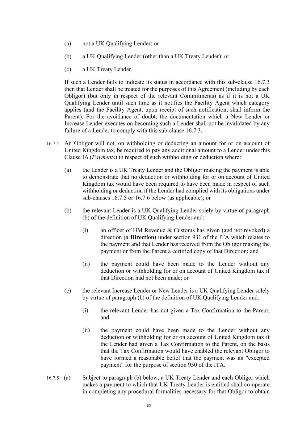 82 (a) not a UK Qualifying Lender; or (b) a UK Qualifying Lender (other than a UK Treaty Lender); or (c) a UK Treaty Lender. If such a Lender fails to indicate its status in accordance with this sub-clause 16.7.3 then that Lender shall be treated for the purposes of this Agreement (including by each Obligor) (but only in respect of the relevant Commitments) as if it is not a UK Qualifying Lender until such time as it notifies the Facility Agent which category applies (and the Facility Agent, upon receipt of such notification, shall inform the Parent). For the avoidance of doubt, the documentation which a New Lender or Increase Lender executes on becoming such a Lender shall not be invalidated by any failure of a Lender to comply with this sub-clause 16.7.3. 16.7.4 An Obligor will not, on withholding or deducting an amount for or on account of United Kingdom tax, be required to pay any additional amount to a Lender under this Clause 16 (Payments) in respect of such withholding or deduction where: (a) the Lender is a UK Treaty Lender and the Obligor making the payment is able to demonstrate that no deduction or withholding for or on account of United Kingdom tax would have been required to have been made in respect of such withholding or deduction if the Lender had complied with its obligations under sub-clauses 16.7.5 or 16.7.6 below (as applicable); or (b) the relevant Lender is a UK Qualifying Lender solely by virtue of paragraph (b) of the definition of UK Qualifying Lender and: (i) an officer of HM Revenue & Customs has given (and not revoked) a direction (a Direction) under section 931 of the ITA which relates to the payment and that Lender has received from the Obligor making the payment or from the Parent a certified copy of that Direction; and (ii) the payment could have been made to the Lender without any deduction or withholding for or on account of United Kingdom tax if that Direction had not been made; or (c) the relevant Increase Lender or New Lender is a UK Qualifying Lender solely by virtue of paragraph (b) of the definition of UK Qualifying Lender and: (i) the relevant Lender has not given a Tax Confirmation to the Parent; and (ii) the payment could have been made to the Lender without any deduction or withholding for or on account of United Kingdom tax if the Lender had given a Tax Confirmation to the Parent, on the basis that the Tax Confirmation would have enabled the relevant Obligor to have formed a reasonable belief that the payment was an "excepted payment" for the purpose of section 930 of the ITA. 16.7.5 (a) Subject to paragraph (b) below, a UK Treaty Lender and each Obligor which makes a payment to which that UK Treaty Lender is entitled shall co-operate in completing any procedural formalities necessary for that Obligor to obtain