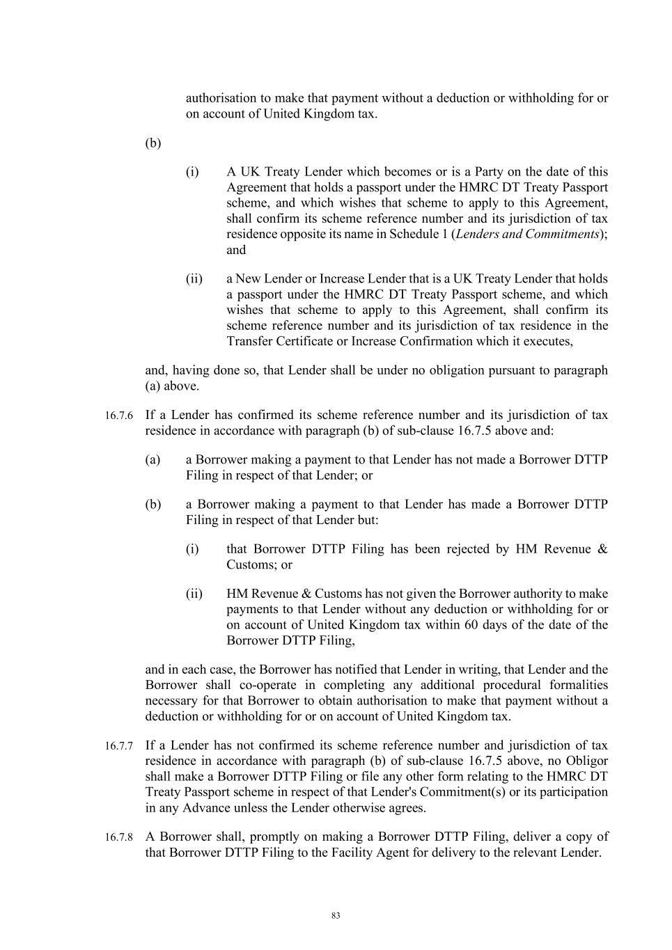 83 authorisation to make that payment without a deduction or withholding for or on account of United Kingdom tax. (b) (i) A UK Treaty Lender which becomes or is a Party on the date of this Agreement that holds a passport under the HMRC DT Treaty Passport scheme, and which wishes that scheme to apply to this Agreement, shall confirm its scheme reference number and its jurisdiction of tax residence opposite its name in Schedule 1 (Lenders and Commitments); and (ii) a New Lender or Increase Lender that is a UK Treaty Lender that holds a passport under the HMRC DT Treaty Passport scheme, and which wishes that scheme to apply to this Agreement, shall confirm its scheme reference number and its jurisdiction of tax residence in the Transfer Certificate or Increase Confirmation which it executes, and, having done so, that Lender shall be under no obligation pursuant to paragraph (a) above. 16.7.6 If a Lender has confirmed its scheme reference number and its jurisdiction of tax residence in accordance with paragraph (b) of sub-clause 16.7.5 above and: (a) a Borrower making a payment to that Lender has not made a Borrower DTTP Filing in respect of that Lender; or (b) a Borrower making a payment to that Lender has made a Borrower DTTP Filing in respect of that Lender but: (i) that Borrower DTTP Filing has been rejected by HM Revenue & Customs; or (ii) HM Revenue & Customs has not given the Borrower authority to make payments to that Lender without any deduction or withholding for or on account of United Kingdom tax within 60 days of the date of the Borrower DTTP Filing, and in each case, the Borrower has notified that Lender in writing, that Lender and the Borrower shall co-operate in completing any additional procedural formalities necessary for that Borrower to obtain authorisation to make that payment without a deduction or withholding for or on account of United Kingdom tax. 16.7.7 If a Lender has not confirmed its scheme reference number and jurisdiction of tax residence in accordance with paragraph (b) of sub-clause 16.7.5 above, no Obligor shall make a Borrower DTTP Filing or file any other form relating to the HMRC DT Treaty Passport scheme in respect of that Lender's Commitment(s) or its participation in any Advance unless the Lender otherwise agrees. 16.7.8 A Borrower shall, promptly on making a Borrower DTTP Filing, deliver a copy of that Borrower DTTP Filing to the Facility Agent for delivery to the relevant Lender.