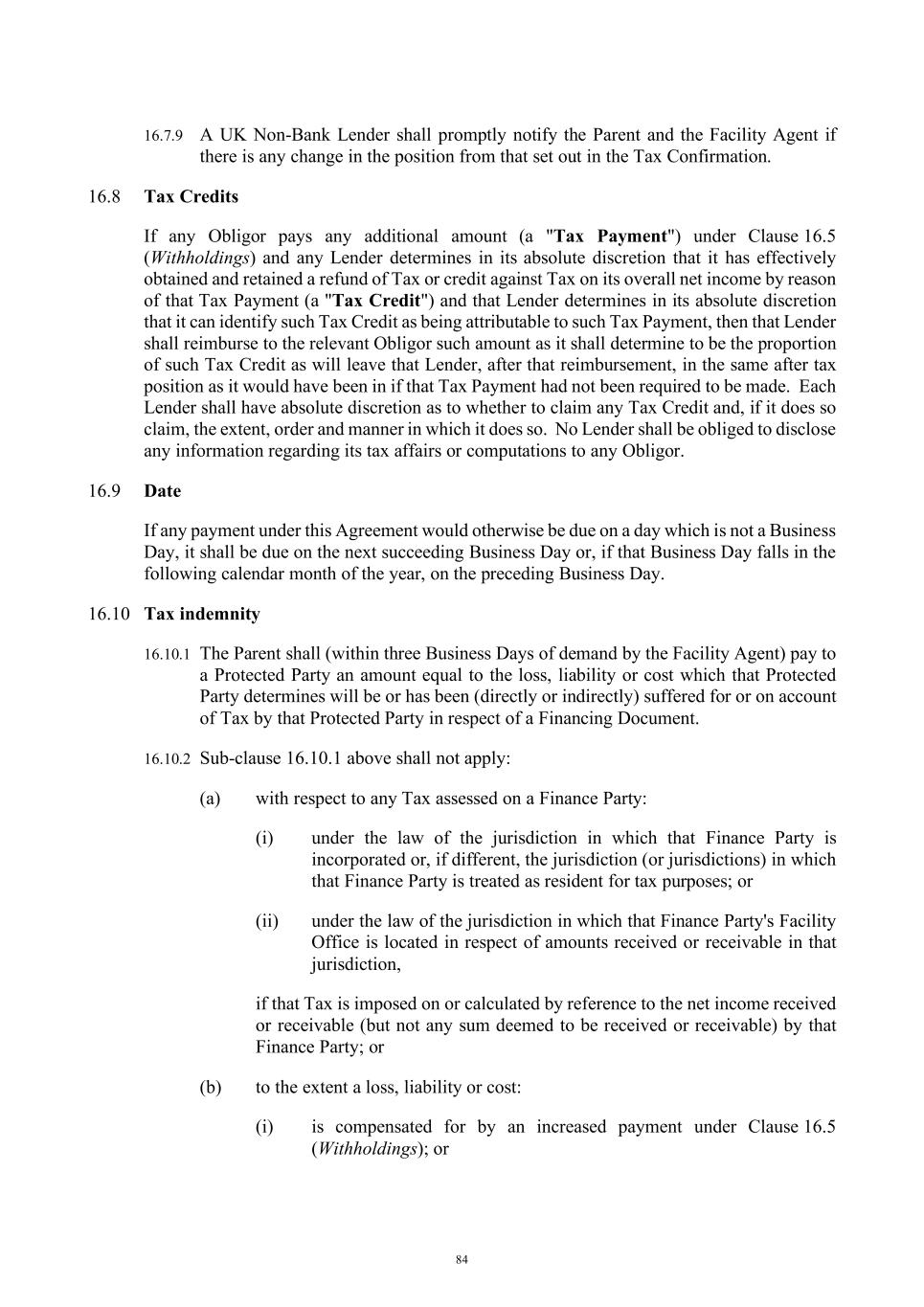 84 16.7.9 A UK Non-Bank Lender shall promptly notify the Parent and the Facility Agent if there is any change in the position from that set out in the Tax Confirmation. 16.8 Tax Credits If any Obligor pays any additional amount (a "Tax Payment") under Clause 16.5 (Withholdings) and any Lender determines in its absolute discretion that it has effectively obtained and retained a refund of Tax or credit against Tax on its overall net income by reason of that Tax Payment (a "Tax Credit") and that Lender determines in its absolute discretion that it can identify such Tax Credit as being attributable to such Tax Payment, then that Lender shall reimburse to the relevant Obligor such amount as it shall determine to be the proportion of such Tax Credit as will leave that Lender, after that reimbursement, in the same after tax position as it would have been in if that Tax Payment had not been required to be made. Each Lender shall have absolute discretion as to whether to claim any Tax Credit and, if it does so claim, the extent, order and manner in which it does so. No Lender shall be obliged to disclose any information regarding its tax affairs or computations to any Obligor. 16.9 Date If any payment under this Agreement would otherwise be due on a day which is not a Business Day, it shall be due on the next succeeding Business Day or, if that Business Day falls in the following calendar month of the year, on the preceding Business Day. 16.10 Tax indemnity 16.10.1 The Parent shall (within three Business Days of demand by the Facility Agent) pay to a Protected Party an amount equal to the loss, liability or cost which that Protected Party determines will be or has been (directly or indirectly) suffered for or on account of Tax by that Protected Party in respect of a Financing Document. 16.10.2 Sub-clause 16.10.1 above shall not apply: (a) with respect to any Tax assessed on a Finance Party: (i) under the law of the jurisdiction in which that Finance Party is incorporated or, if different, the jurisdiction (or jurisdictions) in which that Finance Party is treated as resident for tax purposes; or (ii) under the law of the jurisdiction in which that Finance Party's Facility Office is located in respect of amounts received or receivable in that jurisdiction, if that Tax is imposed on or calculated by reference to the net income received or receivable (but not any sum deemed to be received or receivable) by that Finance Party; or (b) to the extent a loss, liability or cost: (i) is compensated for by an increased payment under Clause 16.5 (Withholdings); or