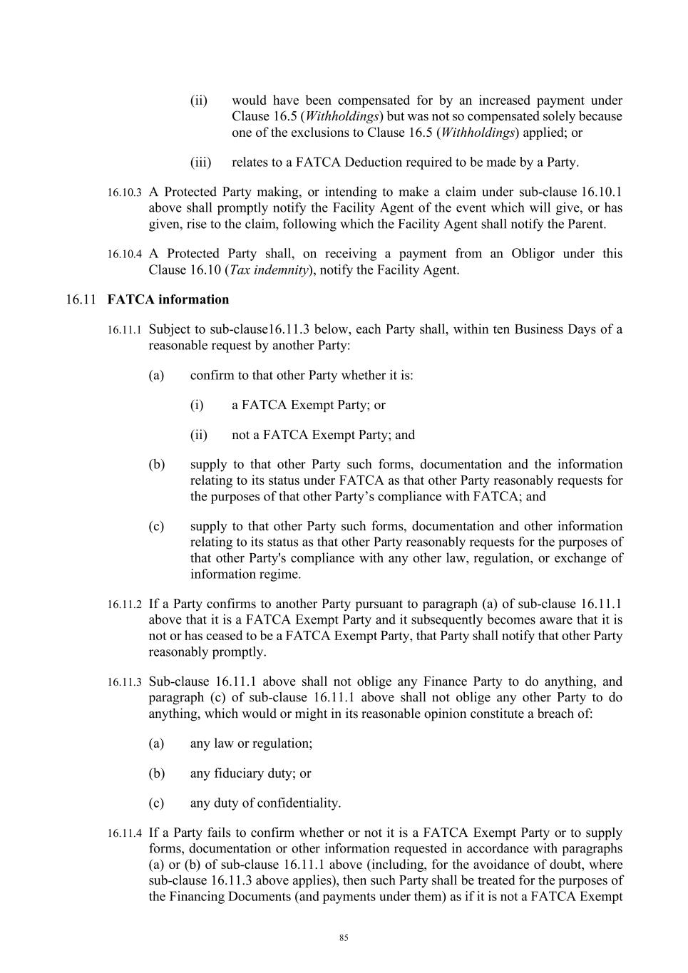 85 (ii) would have been compensated for by an increased payment under Clause 16.5 (Withholdings) but was not so compensated solely because one of the exclusions to Clause 16.5 (Withholdings) applied; or (iii) relates to a FATCA Deduction required to be made by a Party. 16.10.3 A Protected Party making, or intending to make a claim under sub-clause 16.10.1 above shall promptly notify the Facility Agent of the event which will give, or has given, rise to the claim, following which the Facility Agent shall notify the Parent. 16.10.4 A Protected Party shall, on receiving a payment from an Obligor under this Clause 16.10 (Tax indemnity), notify the Facility Agent. 16.11 FATCA information 16.11.1 Subject to sub-clause16.11.3 below, each Party shall, within ten Business Days of a reasonable request by another Party: (a) confirm to that other Party whether it is: (i) a FATCA Exempt Party; or (ii) not a FATCA Exempt Party; and (b) supply to that other Party such forms, documentation and the information relating to its status under FATCA as that other Party reasonably requests for the purposes of that other Party’s compliance with FATCA; and (c) supply to that other Party such forms, documentation and other information relating to its status as that other Party reasonably requests for the purposes of that other Party's compliance with any other law, regulation, or exchange of information regime. 16.11.2 If a Party confirms to another Party pursuant to paragraph (a) of sub-clause 16.11.1 above that it is a FATCA Exempt Party and it subsequently becomes aware that it is not or has ceased to be a FATCA Exempt Party, that Party shall notify that other Party reasonably promptly. 16.11.3 Sub-clause 16.11.1 above shall not oblige any Finance Party to do anything, and paragraph (c) of sub-clause 16.11.1 above shall not oblige any other Party to do anything, which would or might in its reasonable opinion constitute a breach of: (a) any law or regulation; (b) any fiduciary duty; or (c) any duty of confidentiality. 16.11.4 If a Party fails to confirm whether or not it is a FATCA Exempt Party or to supply forms, documentation or other information requested in accordance with paragraphs (a) or (b) of sub-clause 16.11.1 above (including, for the avoidance of doubt, where sub-clause 16.11.3 above applies), then such Party shall be treated for the purposes of the Financing Documents (and payments under them) as if it is not a FATCA Exempt