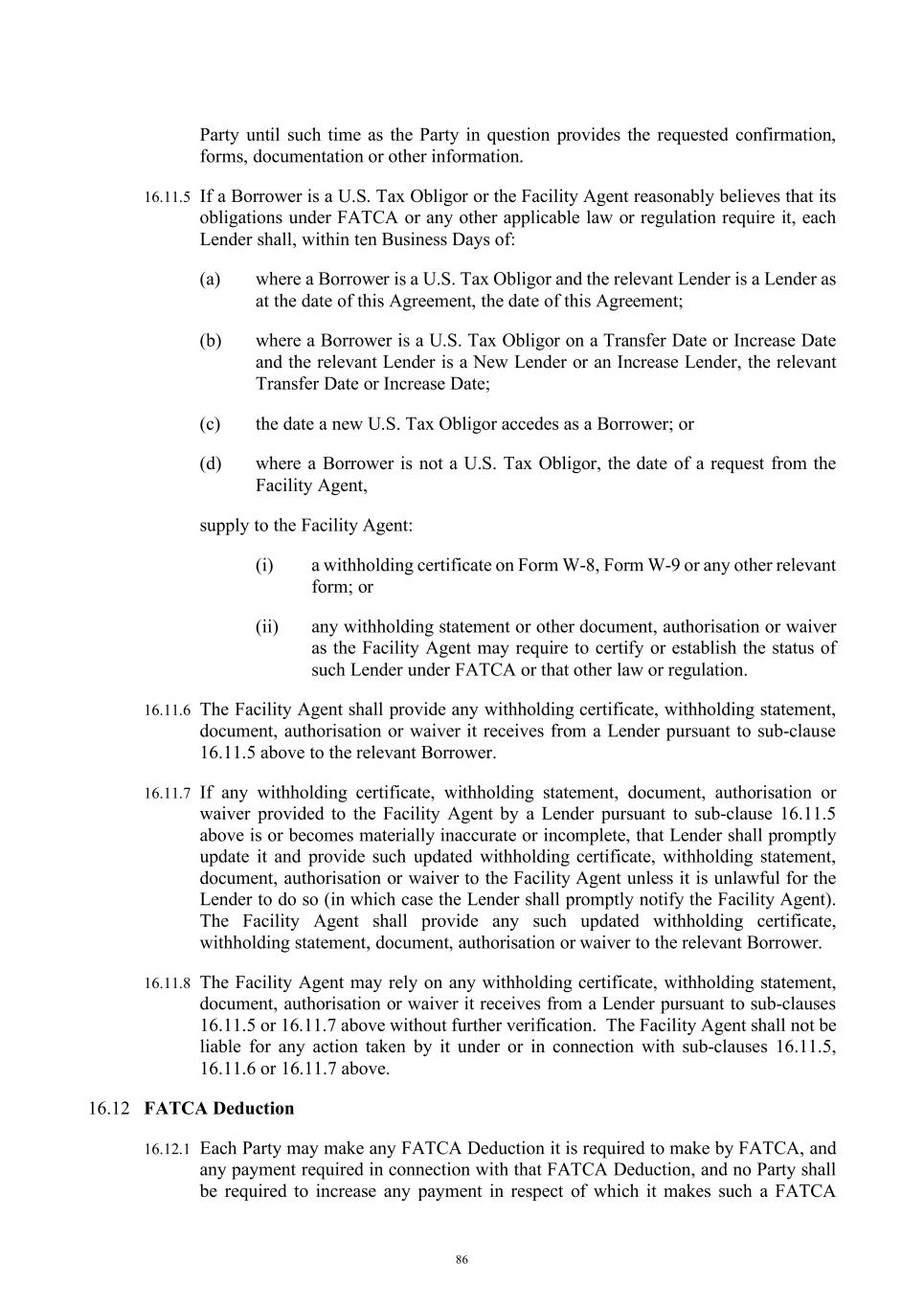 86 Party until such time as the Party in question provides the requested confirmation, forms, documentation or other information. 16.11.5 If a Borrower is a U.S. Tax Obligor or the Facility Agent reasonably believes that its obligations under FATCA or any other applicable law or regulation require it, each Lender shall, within ten Business Days of: (a) where a Borrower is a U.S. Tax Obligor and the relevant Lender is a Lender as at the date of this Agreement, the date of this Agreement; (b) where a Borrower is a U.S. Tax Obligor on a Transfer Date or Increase Date and the relevant Lender is a New Lender or an Increase Lender, the relevant Transfer Date or Increase Date; (c) the date a new U.S. Tax Obligor accedes as a Borrower; or (d) where a Borrower is not a U.S. Tax Obligor, the date of a request from the Facility Agent, supply to the Facility Agent: (i) a withholding certificate on Form W-8, Form W-9 or any other relevant form; or (ii) any withholding statement or other document, authorisation or waiver as the Facility Agent may require to certify or establish the status of such Lender under FATCA or that other law or regulation. 16.11.6 The Facility Agent shall provide any withholding certificate, withholding statement, document, authorisation or waiver it receives from a Lender pursuant to sub-clause 16.11.5 above to the relevant Borrower. 16.11.7 If any withholding certificate, withholding statement, document, authorisation or waiver provided to the Facility Agent by a Lender pursuant to sub-clause 16.11.5 above is or becomes materially inaccurate or incomplete, that Lender shall promptly update it and provide such updated withholding certificate, withholding statement, document, authorisation or waiver to the Facility Agent unless it is unlawful for the Lender to do so (in which case the Lender shall promptly notify the Facility Agent). The Facility Agent shall provide any such updated withholding certificate, withholding statement, document, authorisation or waiver to the relevant Borrower. 16.11.8 The Facility Agent may rely on any withholding certificate, withholding statement, document, authorisation or waiver it receives from a Lender pursuant to sub-clauses 16.11.5 or 16.11.7 above without further verification. The Facility Agent shall not be liable for any action taken by it under or in connection with sub-clauses 16.11.5, 16.11.6 or 16.11.7 above. 16.12 FATCA Deduction 16.12.1 Each Party may make any FATCA Deduction it is required to make by FATCA, and any payment required in connection with that FATCA Deduction, and no Party shall be required to increase any payment in respect of which it makes such a FATCA