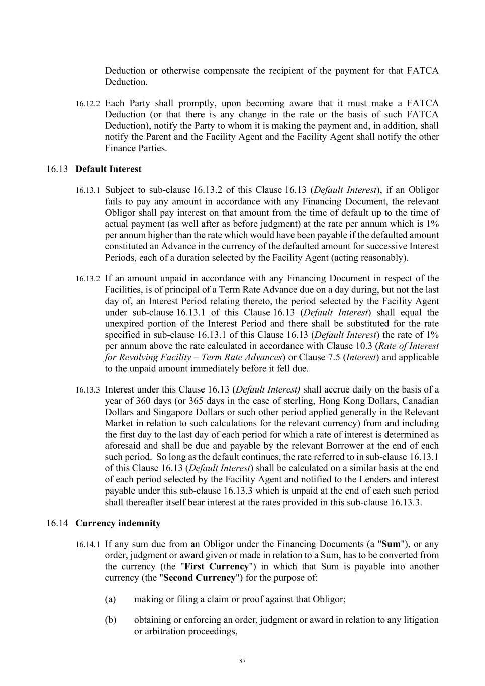 87 Deduction or otherwise compensate the recipient of the payment for that FATCA Deduction. 16.12.2 Each Party shall promptly, upon becoming aware that it must make a FATCA Deduction (or that there is any change in the rate or the basis of such FATCA Deduction), notify the Party to whom it is making the payment and, in addition, shall notify the Parent and the Facility Agent and the Facility Agent shall notify the other Finance Parties. 16.13 Default Interest 16.13.1 Subject to sub-clause 16.13.2 of this Clause 16.13 (Default Interest), if an Obligor fails to pay any amount in accordance with any Financing Document, the relevant Obligor shall pay interest on that amount from the time of default up to the time of actual payment (as well after as before judgment) at the rate per annum which is 1% per annum higher than the rate which would have been payable if the defaulted amount constituted an Advance in the currency of the defaulted amount for successive Interest Periods, each of a duration selected by the Facility Agent (acting reasonably). 16.13.2 If an amount unpaid in accordance with any Financing Document in respect of the Facilities, is of principal of a Term Rate Advance due on a day during, but not the last day of, an Interest Period relating thereto, the period selected by the Facility Agent under sub-clause 16.13.1 of this Clause 16.13 (Default Interest) shall equal the unexpired portion of the Interest Period and there shall be substituted for the rate specified in sub-clause 16.13.1 of this Clause 16.13 (Default Interest) the rate of 1% per annum above the rate calculated in accordance with Clause 10.3 (Rate of Interest for Revolving Facility – Term Rate Advances) or Clause 7.5 (Interest) and applicable to the unpaid amount immediately before it fell due. 16.13.3 Interest under this Clause 16.13 (Default Interest) shall accrue daily on the basis of a year of 360 days (or 365 days in the case of sterling, Hong Kong Dollars, Canadian Dollars and Singapore Dollars or such other period applied generally in the Relevant Market in relation to such calculations for the relevant currency) from and including the first day to the last day of each period for which a rate of interest is determined as aforesaid and shall be due and payable by the relevant Borrower at the end of each such period. So long as the default continues, the rate referred to in sub-clause 16.13.1 of this Clause 16.13 (Default Interest) shall be calculated on a similar basis at the end of each period selected by the Facility Agent and notified to the Lenders and interest payable under this sub-clause 16.13.3 which is unpaid at the end of each such period shall thereafter itself bear interest at the rates provided in this sub-clause 16.13.3. 16.14 Currency indemnity 16.14.1 If any sum due from an Obligor under the Financing Documents (a "Sum"), or any order, judgment or award given or made in relation to a Sum, has to be converted from the currency (the "First Currency") in which that Sum is payable into another currency (the "Second Currency") for the purpose of: (a) making or filing a claim or proof against that Obligor; (b) obtaining or enforcing an order, judgment or award in relation to any litigation or arbitration proceedings,