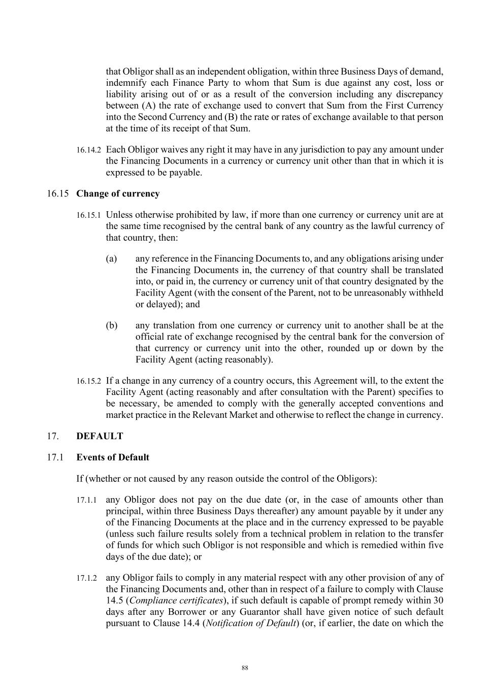 88 that Obligor shall as an independent obligation, within three Business Days of demand, indemnify each Finance Party to whom that Sum is due against any cost, loss or liability arising out of or as a result of the conversion including any discrepancy between (A) the rate of exchange used to convert that Sum from the First Currency into the Second Currency and (B) the rate or rates of exchange available to that person at the time of its receipt of that Sum. 16.14.2 Each Obligor waives any right it may have in any jurisdiction to pay any amount under the Financing Documents in a currency or currency unit other than that in which it is expressed to be payable. 16.15 Change of currency 16.15.1 Unless otherwise prohibited by law, if more than one currency or currency unit are at the same time recognised by the central bank of any country as the lawful currency of that country, then: (a) any reference in the Financing Documents to, and any obligations arising under the Financing Documents in, the currency of that country shall be translated into, or paid in, the currency or currency unit of that country designated by the Facility Agent (with the consent of the Parent, not to be unreasonably withheld or delayed); and (b) any translation from one currency or currency unit to another shall be at the official rate of exchange recognised by the central bank for the conversion of that currency or currency unit into the other, rounded up or down by the Facility Agent (acting reasonably). 16.15.2 If a change in any currency of a country occurs, this Agreement will, to the extent the Facility Agent (acting reasonably and after consultation with the Parent) specifies to be necessary, be amended to comply with the generally accepted conventions and market practice in the Relevant Market and otherwise to reflect the change in currency. 17. DEFAULT 17.1 Events of Default If (whether or not caused by any reason outside the control of the Obligors): 17.1.1 any Obligor does not pay on the due date (or, in the case of amounts other than principal, within three Business Days thereafter) any amount payable by it under any of the Financing Documents at the place and in the currency expressed to be payable (unless such failure results solely from a technical problem in relation to the transfer of funds for which such Obligor is not responsible and which is remedied within five days of the due date); or 17.1.2 any Obligor fails to comply in any material respect with any other provision of any of the Financing Documents and, other than in respect of a failure to comply with Clause 14.5 (Compliance certificates), if such default is capable of prompt remedy within 30 days after any Borrower or any Guarantor shall have given notice of such default pursuant to Clause 14.4 (Notification of Default) (or, if earlier, the date on which the