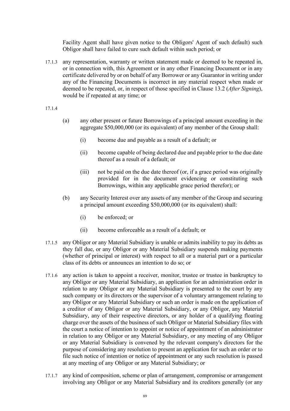 89 Facility Agent shall have given notice to the Obligors' Agent of such default) such Obligor shall have failed to cure such default within such period; or 17.1.3 any representation, warranty or written statement made or deemed to be repeated in, or in connection with, this Agreement or in any other Financing Document or in any certificate delivered by or on behalf of any Borrower or any Guarantor in writing under any of the Financing Documents is incorrect in any material respect when made or deemed to be repeated, or, in respect of those specified in Clause 13.2 (After Signing), would be if repeated at any time; or 17.1.4 (a) any other present or future Borrowings of a principal amount exceeding in the aggregate $50,000,000 (or its equivalent) of any member of the Group shall: (i) become due and payable as a result of a default; or (ii) become capable of being declared due and payable prior to the due date thereof as a result of a default; or (iii) not be paid on the due date thereof (or, if a grace period was originally provided for in the document evidencing or constituting such Borrowings, within any applicable grace period therefor); or (b) any Security Interest over any assets of any member of the Group and securing a principal amount exceeding $50,000,000 (or its equivalent) shall: (i) be enforced; or (ii) become enforceable as a result of a default; or 17.1.5 any Obligor or any Material Subsidiary is unable or admits inability to pay its debts as they fall due, or any Obligor or any Material Subsidiary suspends making payments (whether of principal or interest) with respect to all or a material part or a particular class of its debts or announces an intention to do so; or 17.1.6 any action is taken to appoint a receiver, monitor, trustee or trustee in bankruptcy to any Obligor or any Material Subsidiary, an application for an administration order in relation to any Obligor or any Material Subsidiary is presented to the court by any such company or its directors or the supervisor of a voluntary arrangement relating to any Obligor or any Material Subsidiary or such an order is made on the application of a creditor of any Obligor or any Material Subsidiary, or any Obligor, any Material Subsidiary, any of their respective directors, or any holder of a qualifying floating charge over the assets of the business of such Obligor or Material Subsidiary files with the court a notice of intention to appoint or notice of appointment of an administrator in relation to any Obligor or any Material Subsidiary, or any meeting of any Obligor or any Material Subsidiary is convened by the relevant company's directors for the purpose of considering any resolution to present an application for such an order or to file such notice of intention or notice of appointment or any such resolution is passed at any meeting of any Obligor or any Material Subsidiary; or 17.1.7 any kind of composition, scheme or plan of arrangement, compromise or arrangement involving any Obligor or any Material Subsidiary and its creditors generally (or any